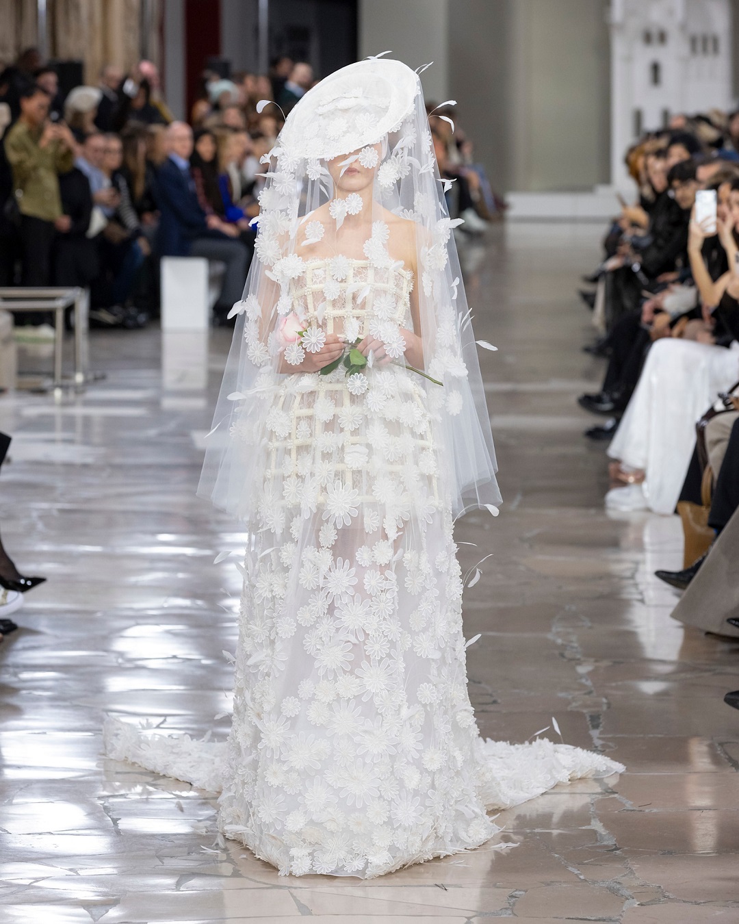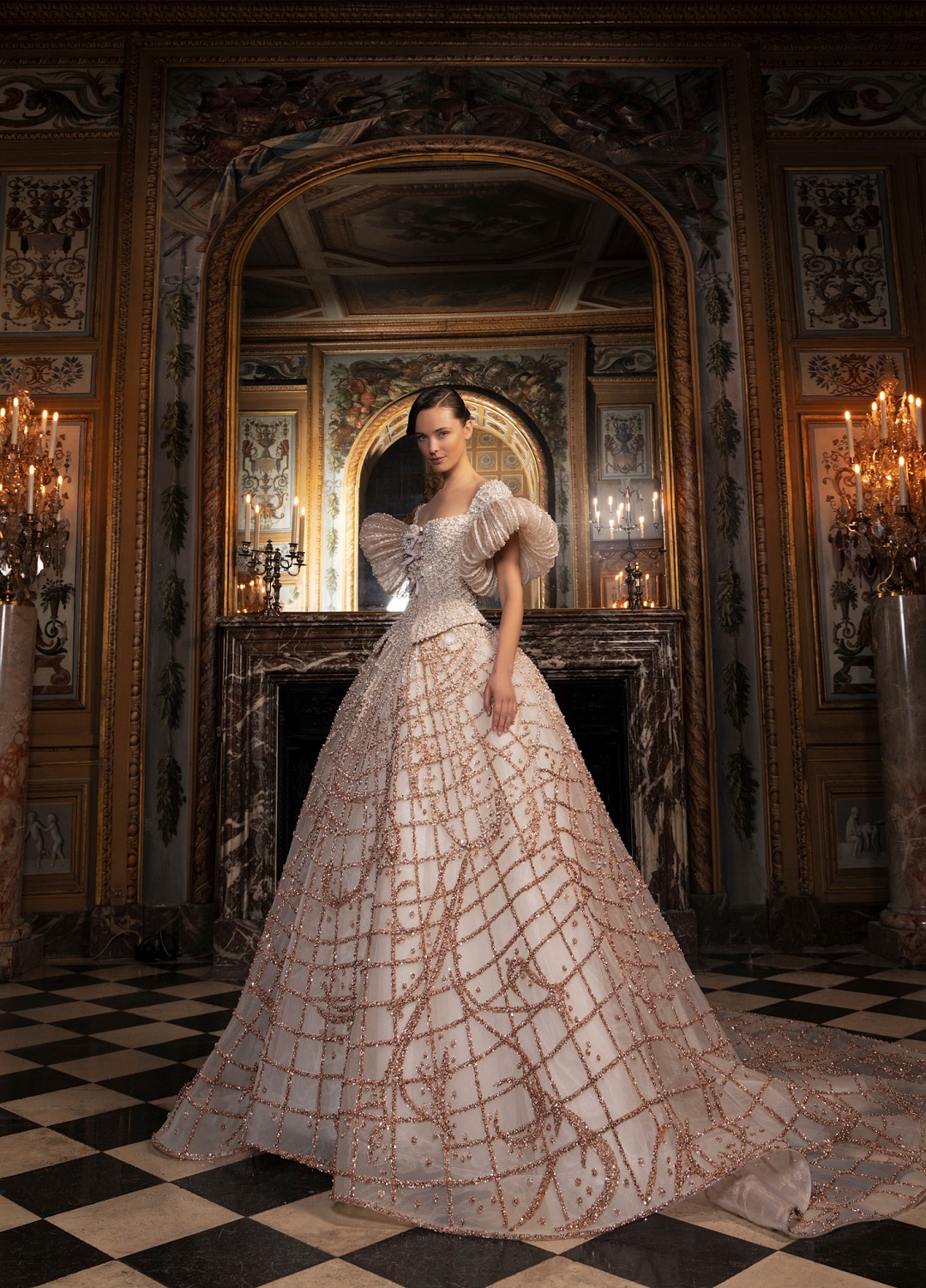 للعروس التي تعشق البساطة الراقية، قدّم جورج شقرا فستان زفاف يميل إلى الطابع الفرنسي الكلاسيكي. التصميم جاء بقصّة هندسية على شكل مربعات تشبه القفص الذهبي، زُيّن لاحقًا بتطريزات الورود الناعمة. أما طرحة الدانتيل المزينة بالريش، مع قبعة مائلة من الدانتيل، فأضفت لمسة شاعرية حالمة تليق بأجواء الهوت كوتور الباريسي.
