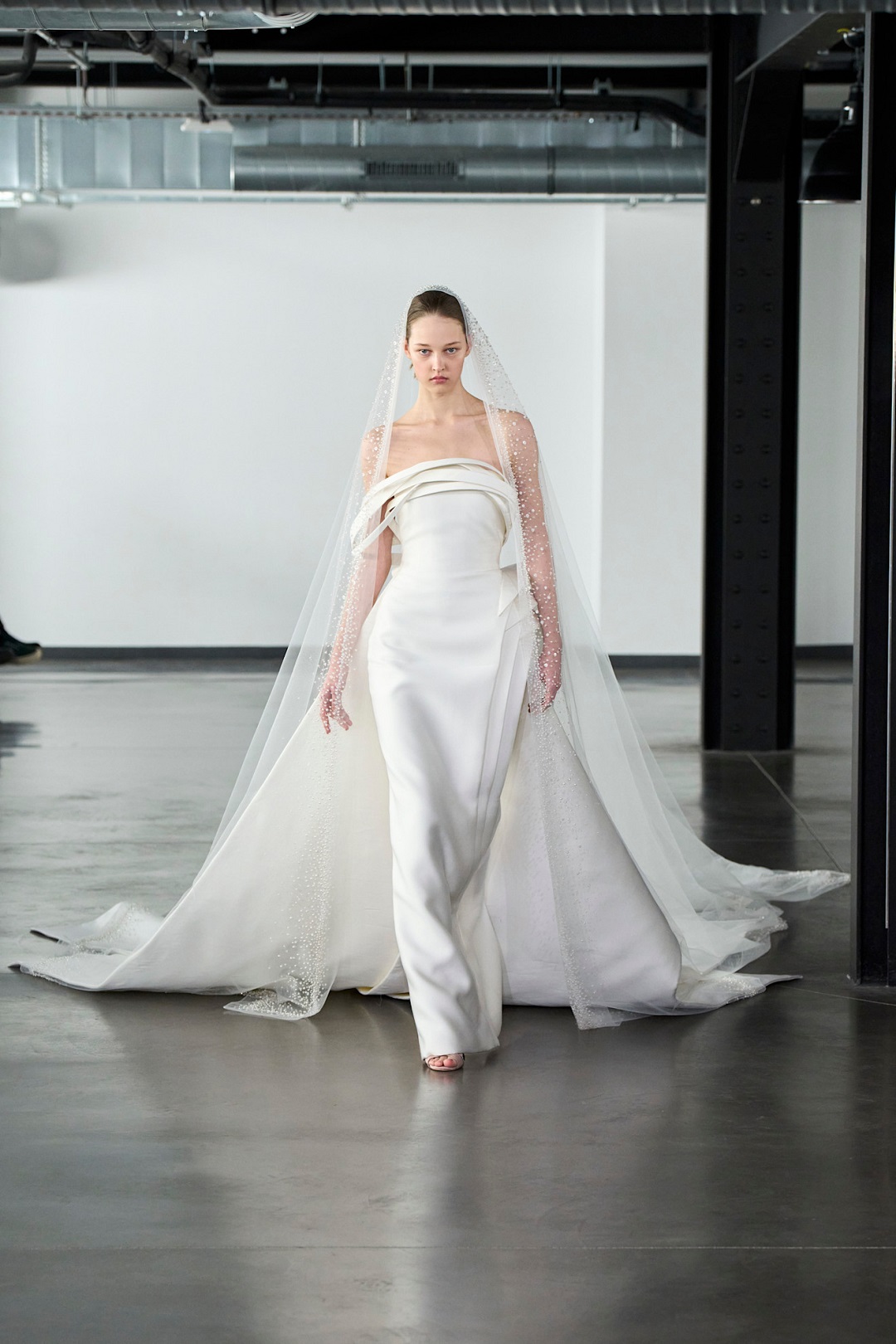 أما دار أرماني بريفيه Armani Privé، فقد اختارت أن تقدّم فستان زفاف يعكس الغموض والرقي في آنٍ واحد. التصميم جاء طويلاً وبقصّة واسعة من قماش التفتا الفخم، مزينًا بتطريزات عصرية ناعمة، واللافت في هذا الفستان الرقبة العالية المطرزة بالخرز، مع طرحة طويلة تغطي الفستان بالكامل، ومطرزة بحبات الخرز اللامعة، لتمنح العروس حضورًا قويًا وأناقة غير تقليدية خلال أسبوع الهوت كوتور في باريس.