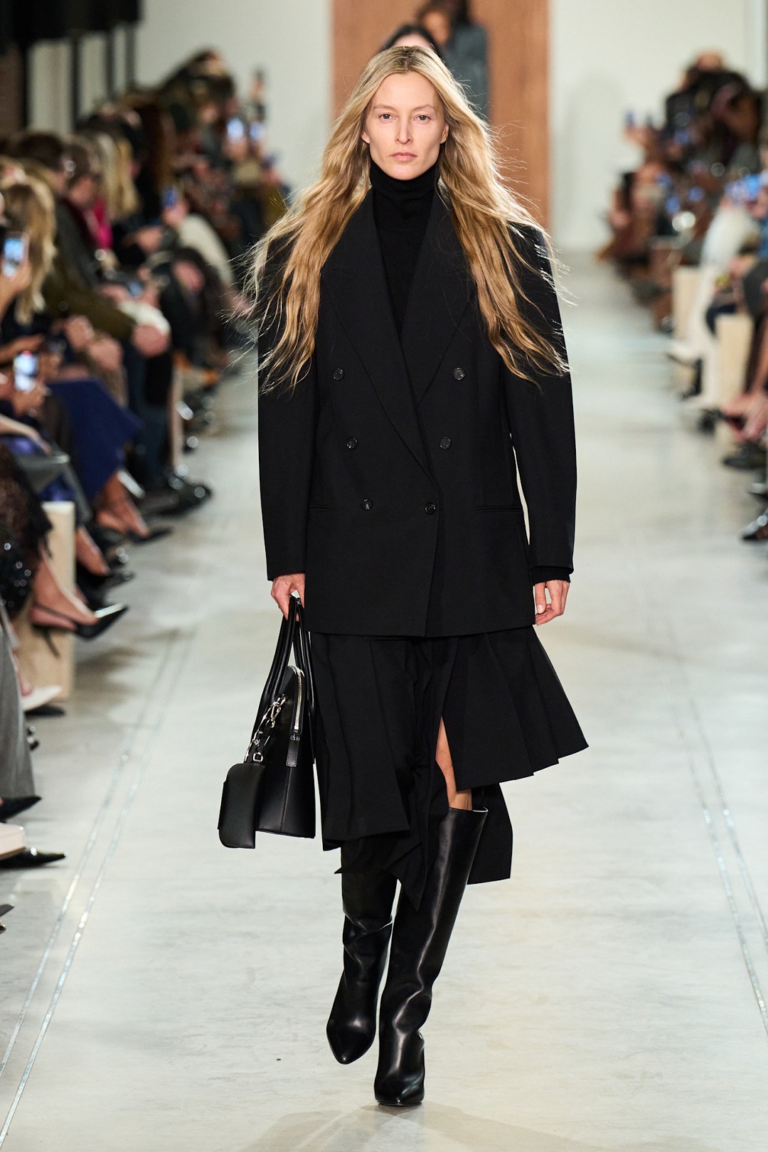 يمكنكِ أيضاً تنسيق التنورة البليسيه الميدي بهذه الطريقة الذكية لإخفاء عيوب الجسم ومنح القوام مظهراً أكثر توازناً وأناقة، وهذا التنسيق ظهر بأسلوب أنيق في مجموعات علامة مايكل كورس Michael Kors، اعتمد على الجاكيت البليزر الواسع والطويل نسبياً، حيث يساعد هذا القصّ على إخفاء منطقة البطن ومنح الإطلالة خطوطاً طولية ناعمة تُبرز الرشاقة.