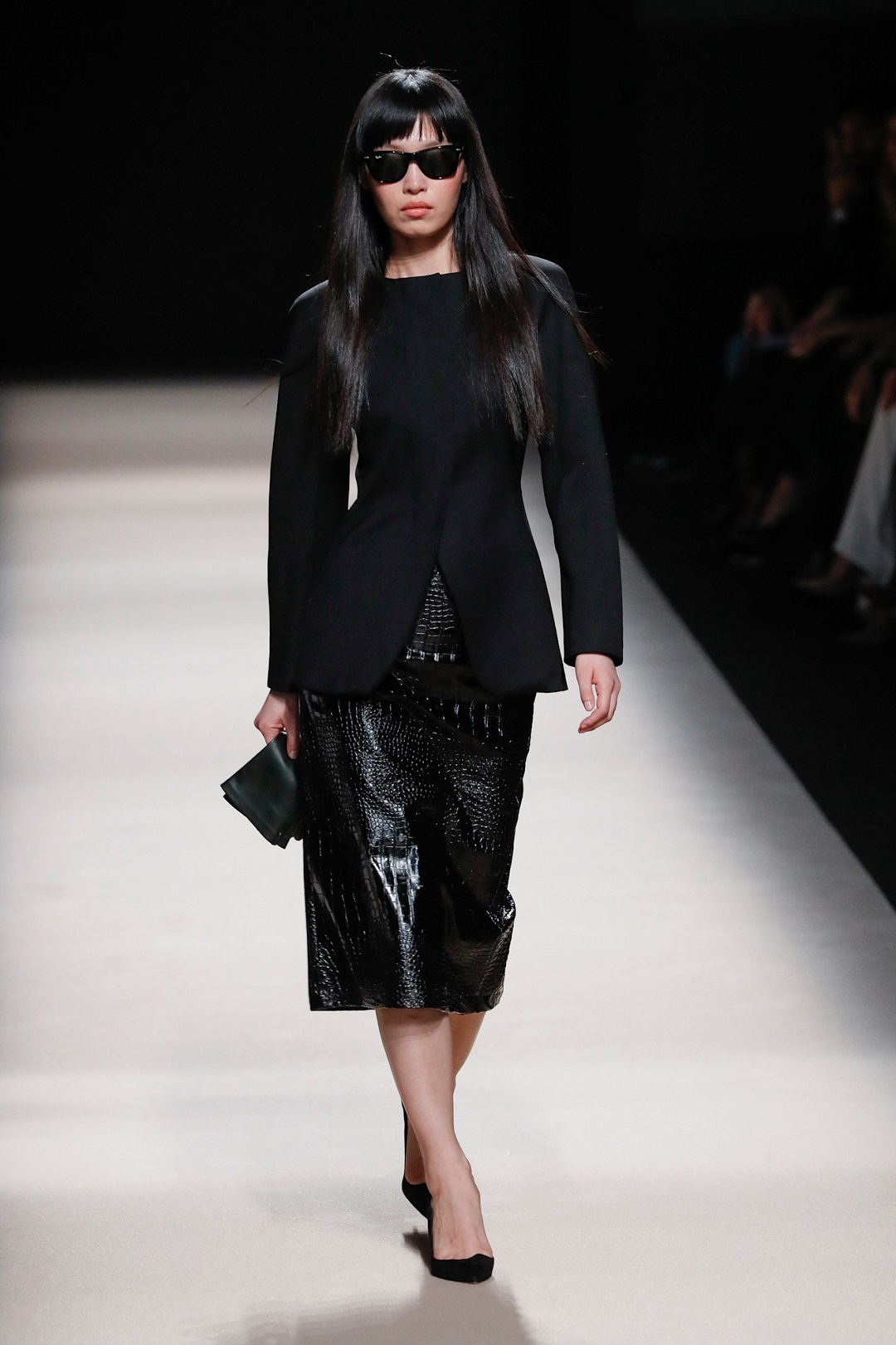 يمكنكِ استلهام هذا اللوك من علامة Riviere، حيث تم تنسيق التنورة الجلد المستقيمة مع جاكيت فاخر من الصوف بقصّة Peplum، وهي القصّة المنفوخة قليلاً عند منطقة الخصر والبطن، والتي تُعرف بقدرتها على إخفاء عيوب البطن مع إبراز الخصر بشكل أنثوي أنيق، إذ إن التوازن بين القصّتين يمنحكِ قواماً أكثر تحديداً من دون أي تكلّف.