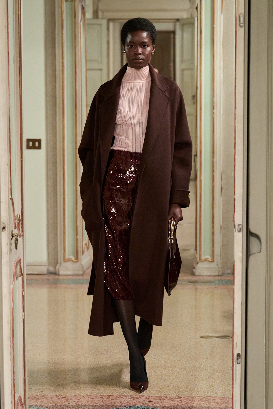 أما إذا كنتِ ممتلئة من ناحية الأرداف، فيُفضَّل اختيار تنسيق أكثر انسيابية وطولاً، مثل اللوك الذي قدّمته علامة إليزابيتا فرانكي Elisabetta Franchi، وهنا يعتمد الأسلوب الطبقي أيضاً، ولكن مع تنورة أطول تتناغم مع المعطف الطويل والتوب، ما يساعد على إخفاء الامتلاء وتوزيع القوام بشكل متوازن. اللافت في هذا التنسيق هو التدرج الذكي في الألوان، من البرغندي إلى الوردي الروز، والذي يخلق ستايلاً مريحاً للعين ويُضفي نعومة وأناقة على الإطلالة من دون إبراز المناطق الممتلئة.