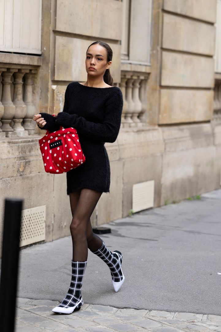 - يمكن تنسيق الجوارب المنقطة بالأبيض والأسود مع فستان رمادي، وأكسسوارات زاهية أو ميتاليكية كالحذاء البلاتفورم والحقيبة الفضية. وللإطلالات البسيطة، حافظي على بساطة التصميم لتجنب المظهر الطفولي أو المبالغ فيه.