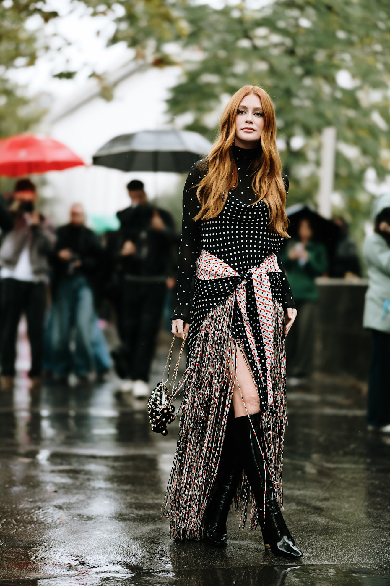 كما يُعدّ فستان البولكا دوت متوسط الطول أو بقصة A-line خياراً أنيقاً لحضور حفل زفاف، فهو يُضفي لمسة مرحة وراقية في آنٍ واحد. اختاري الفستان المتوسط أو الطويل المنقط، فضفاض والرومانسي، ربما بأكمام واسعة، ويبدو الفستان الخالي من الأكمام الخيار الممتاز. احملي حقيبة منمقة جلدية Flapbag من شانيل Chanel.