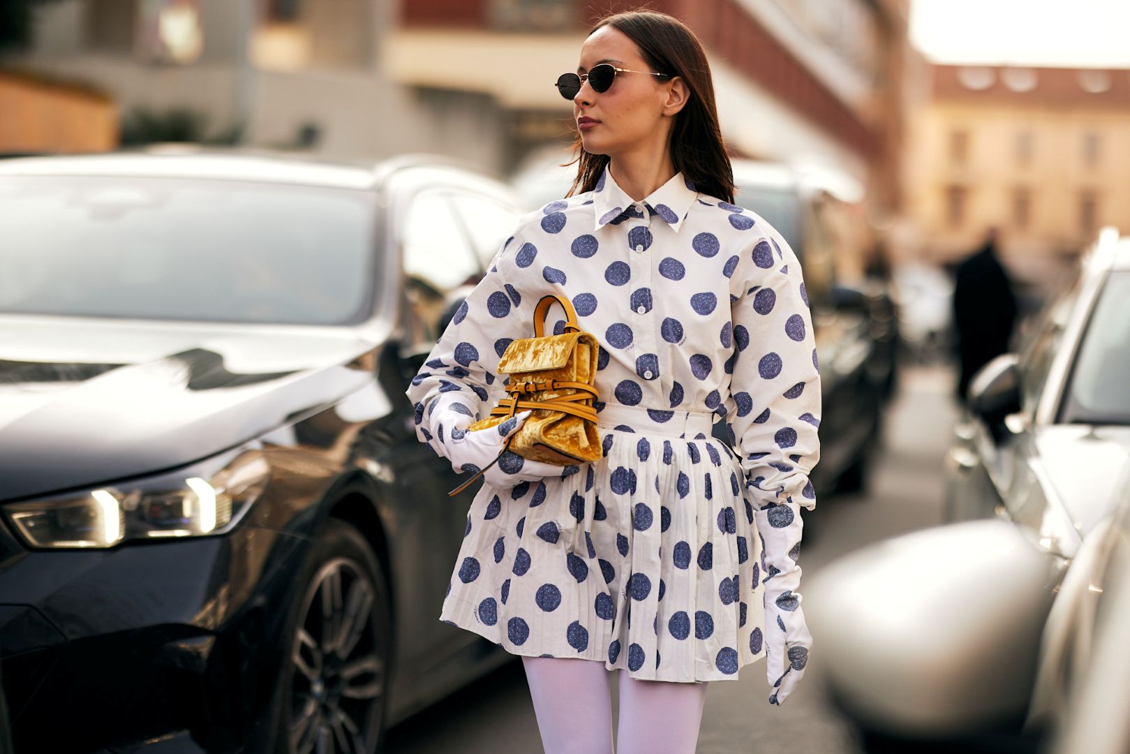 نسقي تنورة ميدي من الحرير بسيطة بنقاط البولكا الزرقاء مع قميص حريري منقط من القماش نفسه، أو كنزة صوفية سميكة في الشتاء. ويمكن حمل حقيبة كبيرة بلون الأصفر الخردلي مع جوارب بيضاء مطاطية وحذاء كحلي Ankle Boots. ولا تنسي إضافة القفازات المنقطة للارتقاء بالزي أكثر.