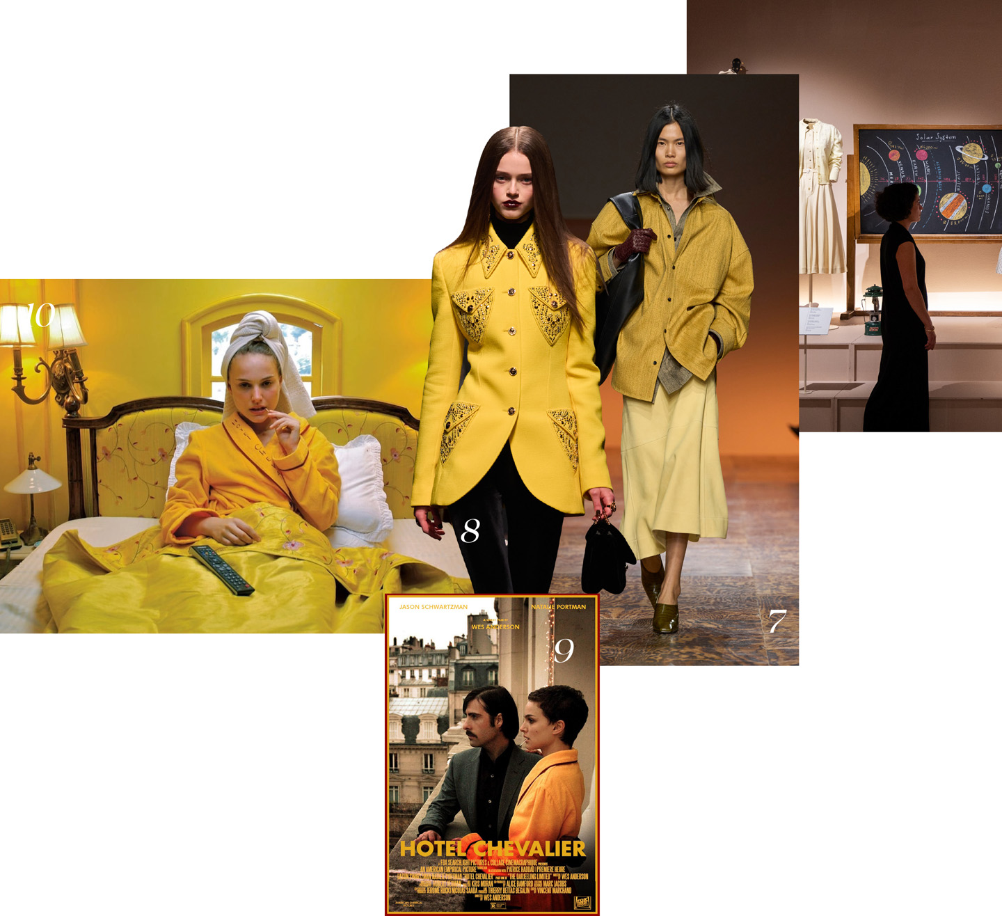 كذلك، عُرِفَ أندرسون بعالمه البصري شديدِ الخصوصيَّة، وعلى الرغمِ من اختلافِ أعماله باختلافِ الأزمنةِ، والأمكنةِ، والمزاجِ العامِّ لكلِّ فيلمٍ إلا أن هناك هدفاً جمالياً واضحاً يجمعها جميعاً. وهذه الهويَّةُ البصريَّةُ المحبَّبة، تجاوزت شاشةَ السينما، لتتحوَّلَ إلى مادةٍ، تُعرَضُ في معارضَ مخصَّصةٍ لأعماله، أبرزها بـ Fondazione Prada في ميلانو حيث صمَّم أيضاً مقهى Bar Luce في تجسيدٍ حي لعالمه السينمائي خارجَ إطارِ الفيلم. وفي هذا الموسم، لم تعرض منصَّاتُ الموضةِ ملابسَ فقط، بل وقدَّمت أيضاً دعوةً لعيشِ الحياةِ كما لو كنا داخلَ أحد أفلامِ المخرجِ بطريقةٍ شاعريَّةٍ، وأنيقةٍ.