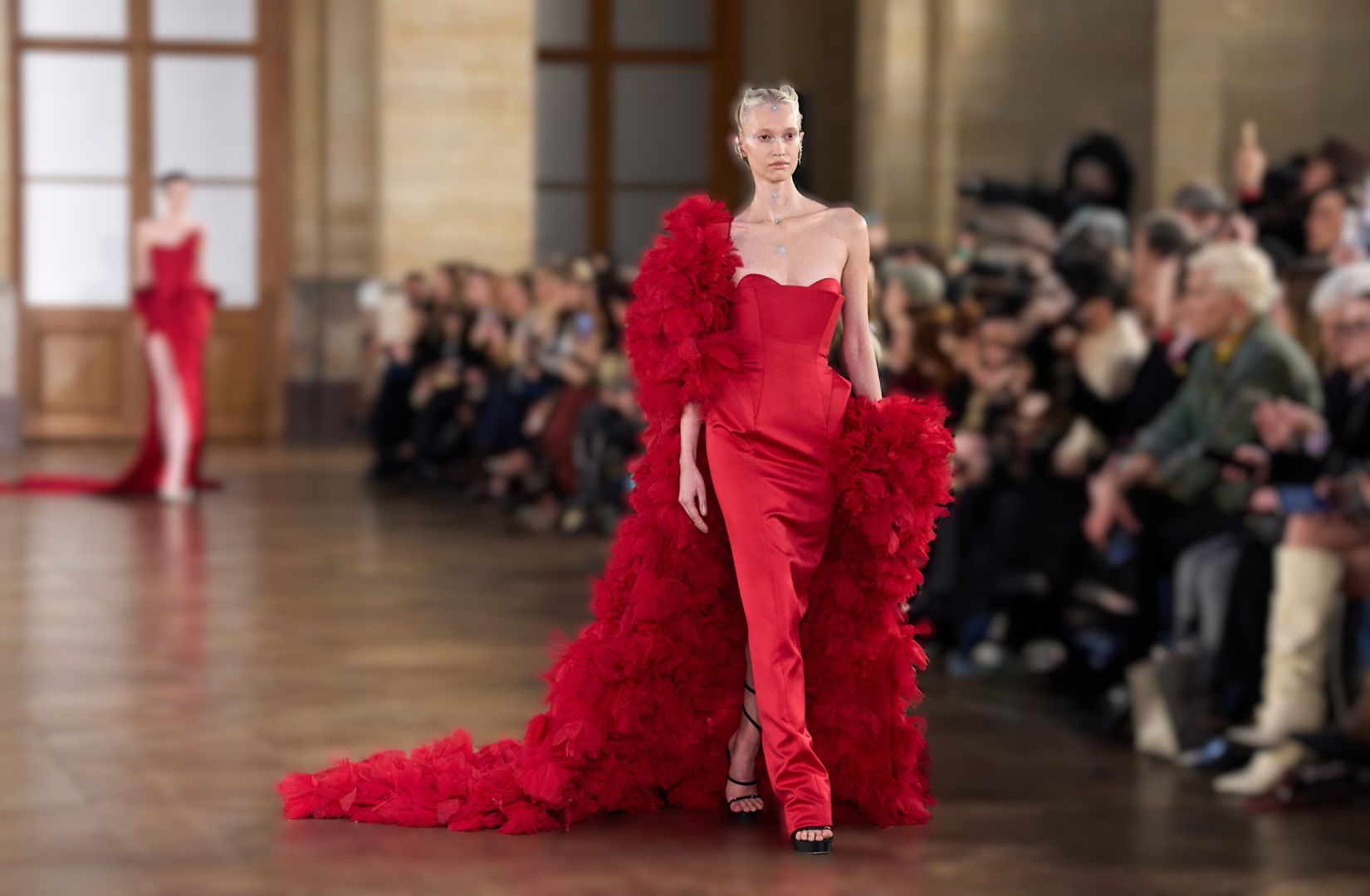الأحمر الزاهي المائل الى السومون يُعد من أكثر الدرجات رقيّاً ودفئاً. يعكس نضجاً وأناقة هادئة، ويليق بالفساتين الطويلة أو التصاميم ذات القصّات الكلاسيكية كالفستان الذي أطلقته دار كارولينا هيريرا Carolina Herrera من وحي حقبة الخمسينيات بالخصر المنخفض والقصة المنفوشة. يمكن تنسيقه مع أكسسوارات ذهب وردي أو مجوهرات بأحجار داكنة، مع مكياج بلمسات برونزية دافئة. إنه خيار مثالي لمن تبحث عن إطلالة راقية بعيدة عن الصخب.