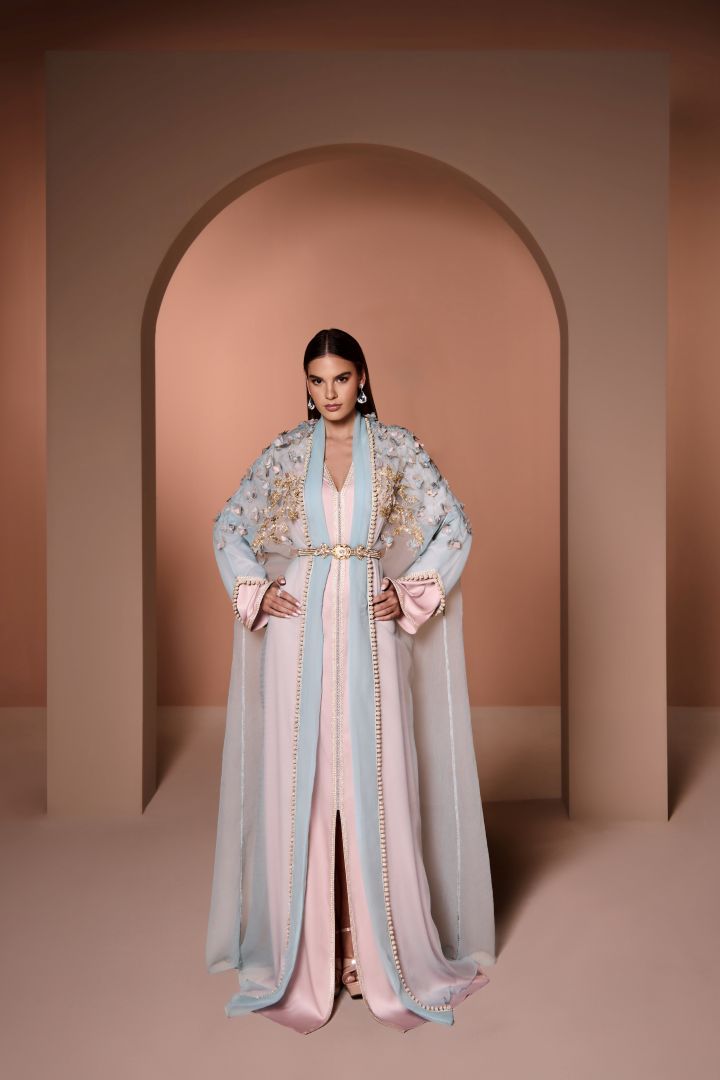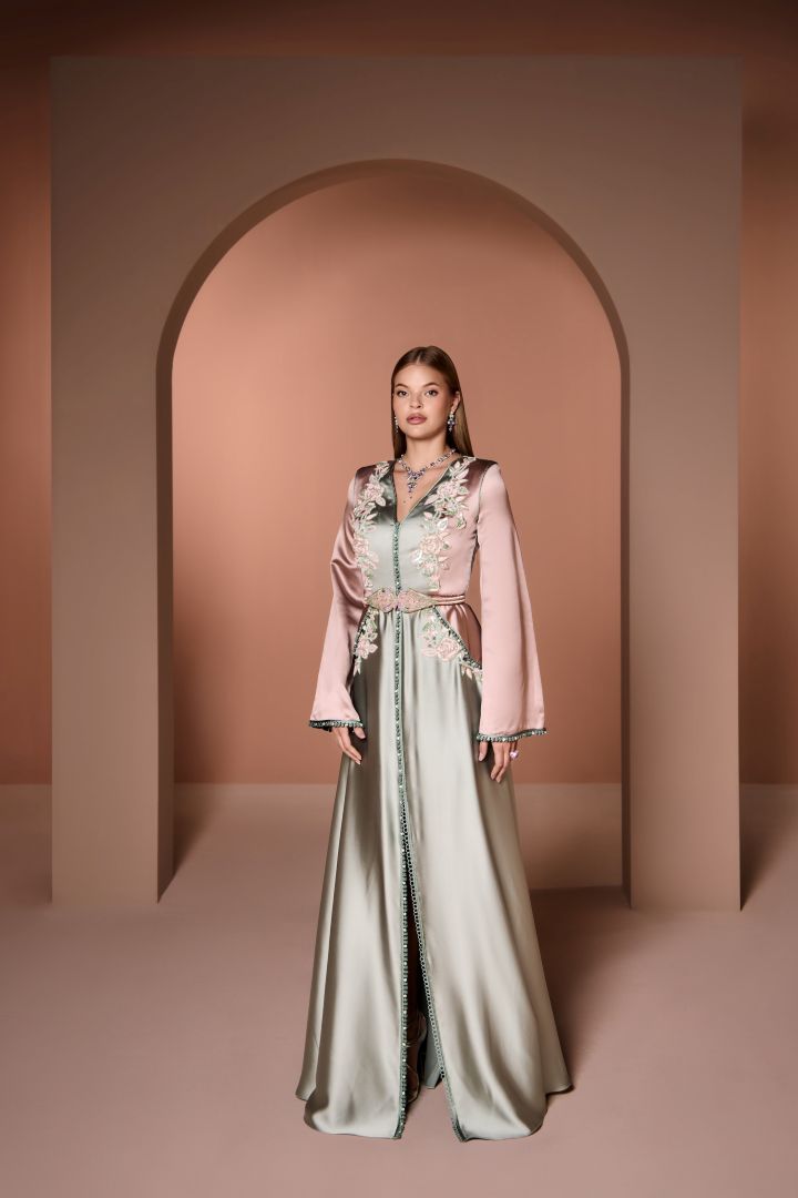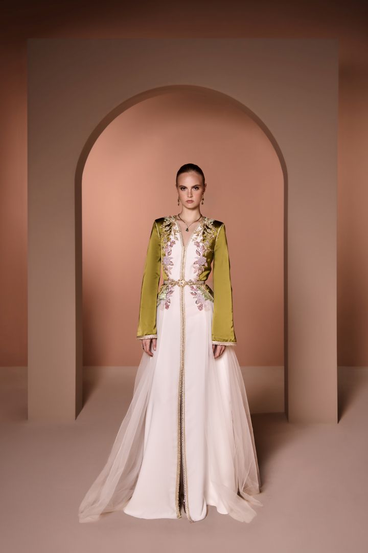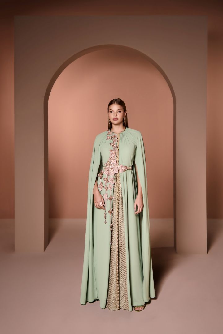 - القفطان الأخضر الباستيل، ذو الأكمام المفتوحة والمستوحى من الكاب بقصته الفخمة والذي يقترن بالتطريز باليد على شكل طبقات تأتي من داخل القماش.