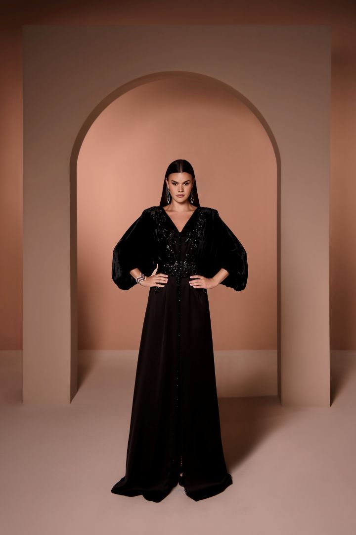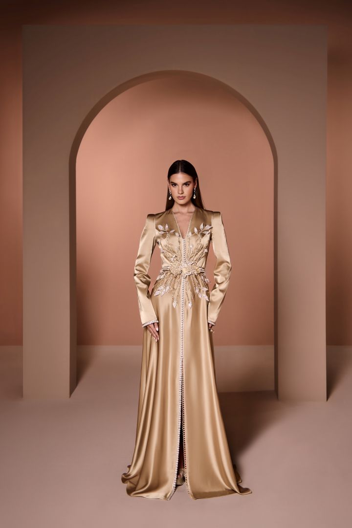 تفضل المصممة سلمى بنعمر قماش الكريب الذهبي للإطلالات المسائية، وتهوى إضافة الزهور وأوراق النباتات التي تتفتح بتقنية تطريز أبعاد ثلاثية تارةً، في حين تعكس الألوان الباستيل أنوثة ساحرة تزداد كهمساتٍ من سحر رمضان. فبالنسبة للمصممة، "يحمل كل قفطان وهجه الخاص وتحتفي كل قطعة بالأناقة والخشوع."