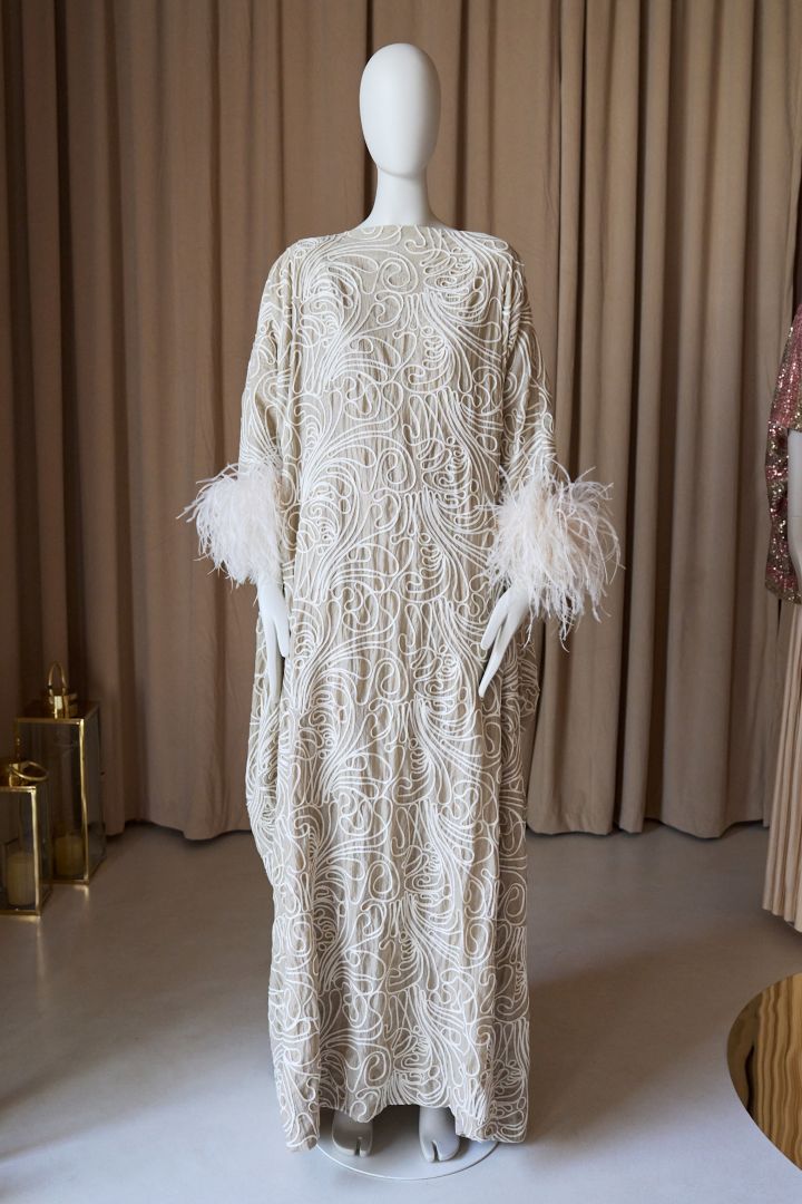قفطان من الساتان العاجي بتصميم شرنقة مطرز بنمط تجريدي ومزخرفة بالريش الأبيض.