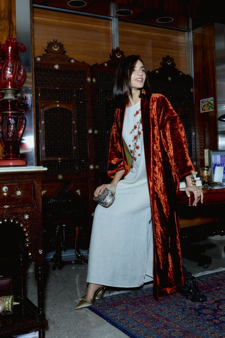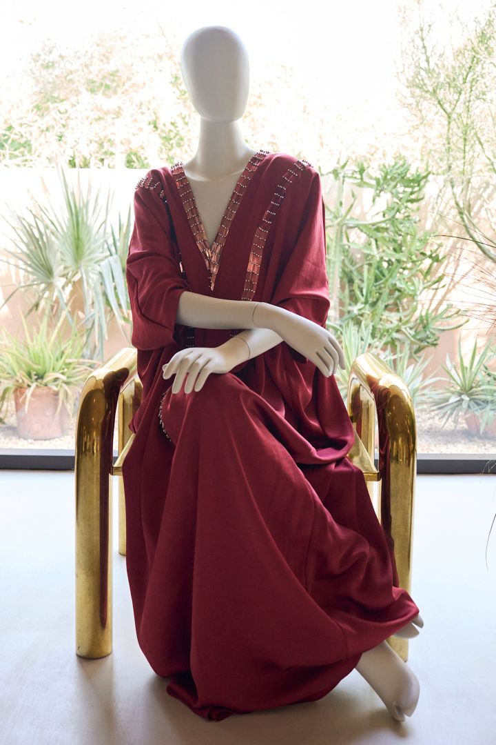 ومن بين أبرز القطع: طقم كيمونو المخمل الأحمر، عباية روبي بلوسوم، وبونشو شروق الشمس.