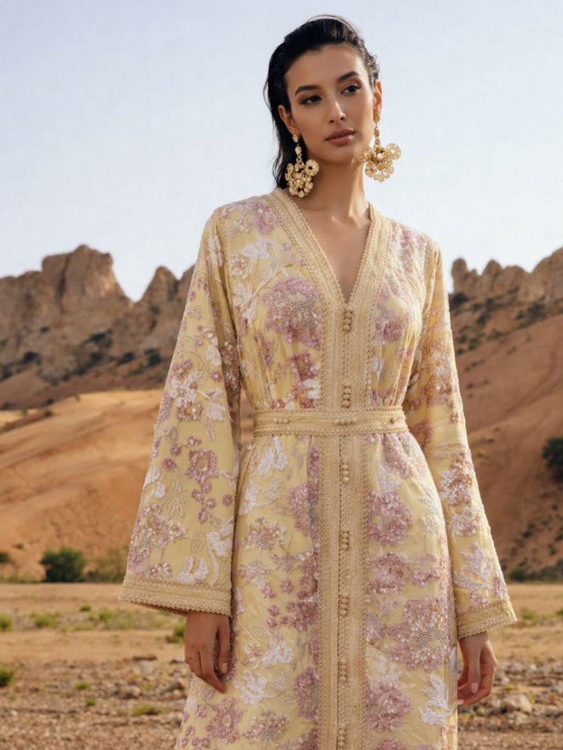 كما صُنع هذا القفطان بألوان بيج أنيقة، ويتميز بتطريز تجريدي أبيض متقن يغطي كامل الفستان، مما يضفي عليه عمقاً وثراءً ملموساً. يبرز التصميم المريح بأساور مزينة بريش أنيق، مما يضيف لمسة من السحر والفخامة إلى الأكمام الواسعة. كما يتميز الفستان بياقة قارب أنيقة وطول يصل إلى الأرض؛ ليجمع بين الفخامة العصرية والرقي الخالد. وإليكِ قفطان قرميدي مطرز بياقة على شكل حرف V، ويتميز هذا القفطان بتطريزات لامعة من الترتر الأحمر والمعدني تمتد على طول الجزء العلوي بنمط هندسي جريء. وينسدل القماش بانسيابية؛ ليُشكّل قفطاناً واسعاً يُضفي عليه قواماً منحوتاً يجمع بين الراحة والأناقة. مثالي للمناسبات الرسمية.