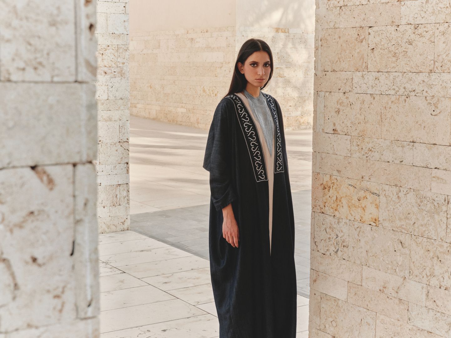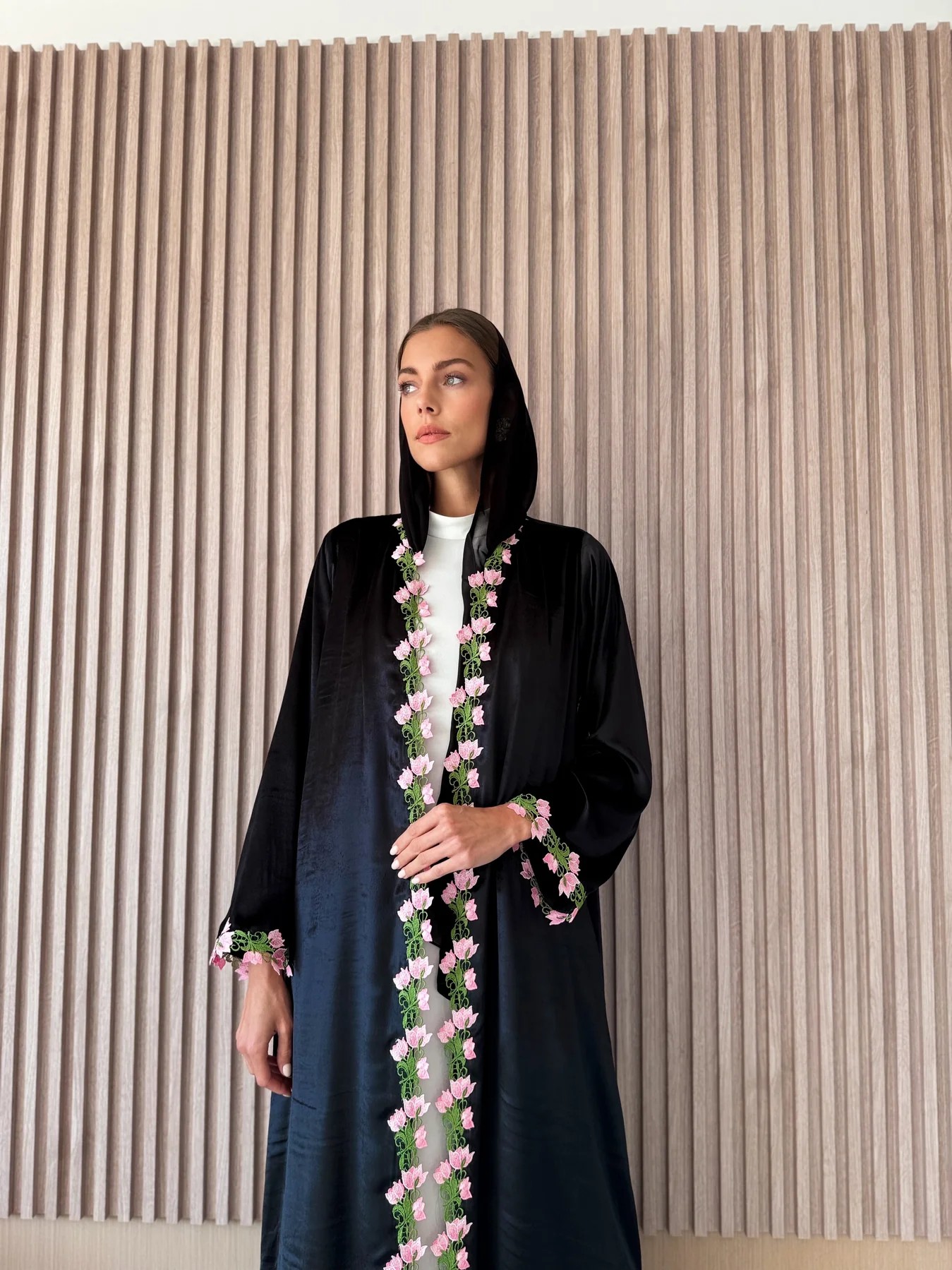 ويتميز أسلوبها في التصاميم باستعمالها مواد معادة التدوير والتزامها معايير الاستدامة، وقد اخترنا لكِ من عباياتها تصاميم من المخمل المطرز بالورود الزهرية وعباية سوداء من الحرير منفذة بتطريز محبوك باليد، يجسد الزهور على أطراف العباية المفتوحة والمزودة بغطاء للرأس.