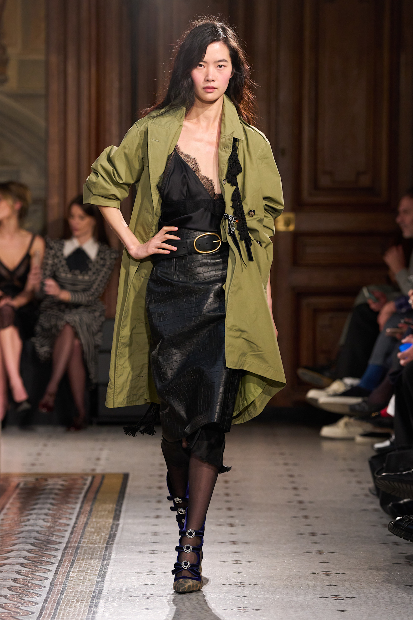 بعد أن جعلت سارة بيرتون Sarah Burton عرض جيفنشيGivenchy مُركزاً على المرأة، وسّعت آفاقه أكثر مع عرضها الخريفي المذهل؛ مُطلقةً العنان لأقمشة الملابس الرجالية، والمخمل، وطبعات الحيوانات، وحرير الكيمونو، والدانتيل، والخيوط الفضية، واستعانت بزخرفاتمن الفرو الفاخر؛ مُنسقةً كلّ ذلك ببراعةٍ فائقة. وصممت منصة عرضها الخريفية المظلمة كجهاز عرضٍ سينمائي عملاق؛ مما أضفى جوّاً ساحراً، وحجب مسار العرض المتعرّج كلّ عارضة لتبرز كل إطلالة لوحدها؛ مُتيحاً التركيز على كلّ شخصية.