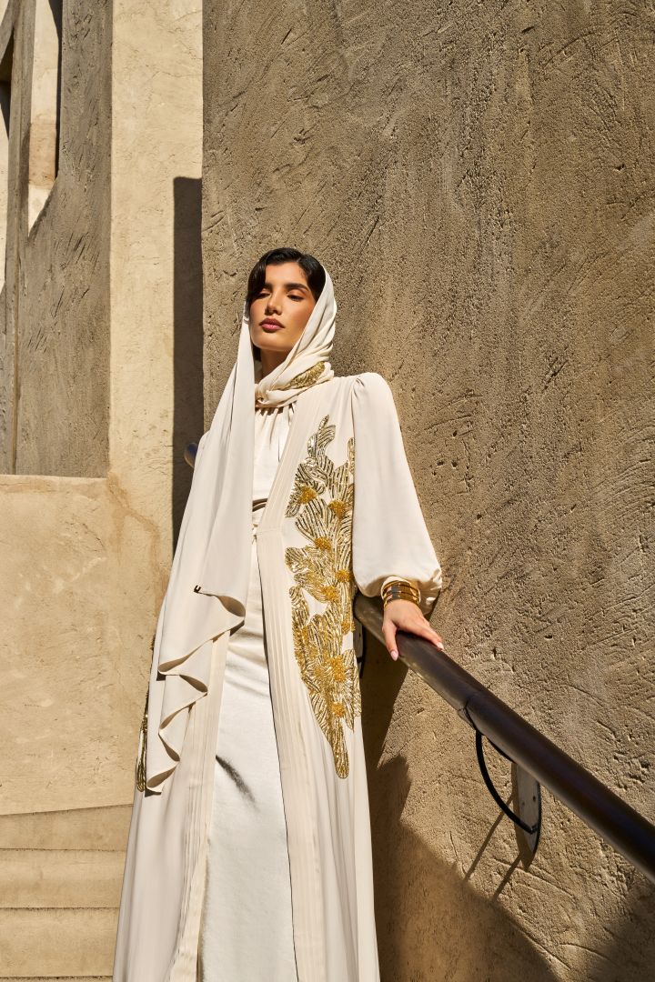 أطلقت دار إليزابيتا فرانكي Elisabetta Franchi العباية البيضاء الراقية المفتوحة والمنسقة مع ثوب أبيض، وهي مزخرفة بتطريزات بخيوط ورسوم ذهبية، وتم تنسيق طرحة من الفوال الأبيض الشفاف لإطلالة راقية عصرية للأم الكلاسيكية.