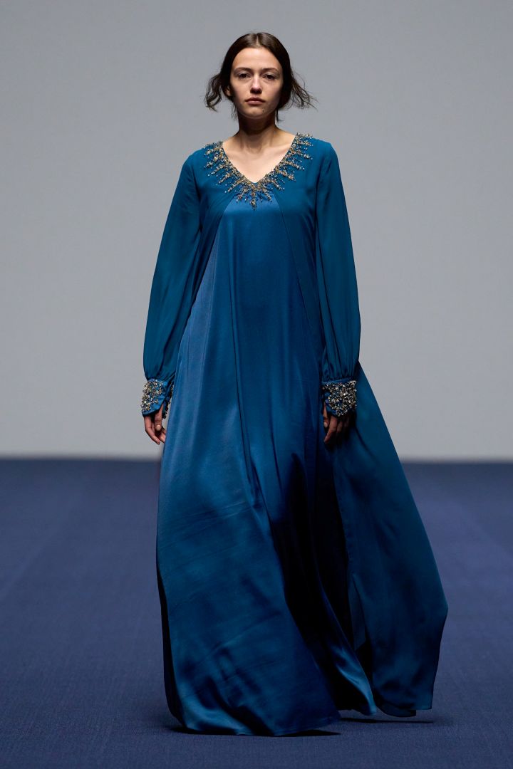 إليكِ هذه العباية المصنوعة من الساتان الحريري بلون أزرق كوبالتي، وهو لون رائح للعام 2026، وقد تم تطريز الياقة بأحجار كريستالية ملونة لامعة، بطريقة لا تستدعي أن تنسّقي معها المجوهرات، كما تمت زخرفة الأكمام بالطريقة نفسها.