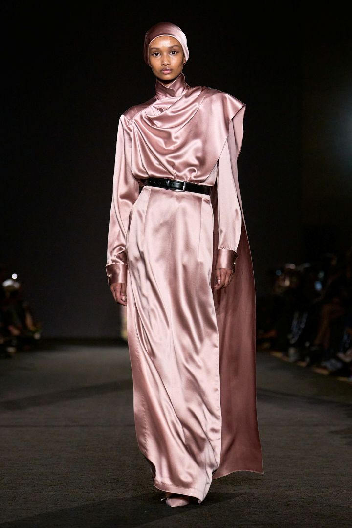 وللباحثات عن إطلالة محتشمة، أطلقت دار برابال غورونغ Prabal Gurung الزي الشرقي المصنوع من الحرير بلون زهري ثلجي، ويتسم بقصة مستقيمة وطويلة مع حزام رفيع لتحديد الخصر، وتم تنسيق حجاب من القماش نفسه بطابع مونوكرومي وإكسسوارات بلون زهري باستيل.