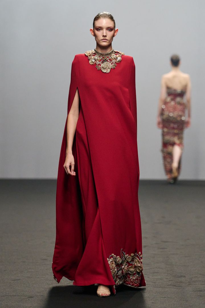 إليكِ العباية بلون كرزي من الكريب، وهي منفذة بتصميم الكاب المفتوح، وتم تطريزها بزخرفات ذهبية عند العنق وعلى حواف الزيّ، وهي تجسد تصميم الشباك وبتلات الورود، وهي من تصميم دار ريزمان روزيني Rizman Ruzaini.