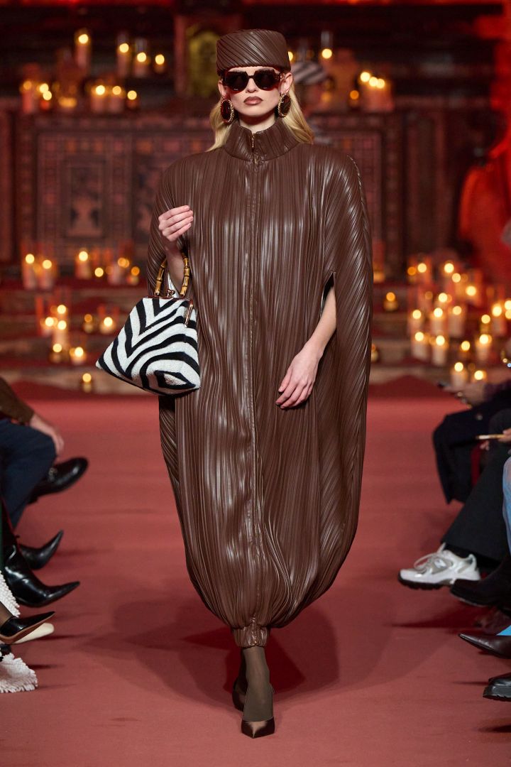 إليكِ العباية المصنوعة من الحرير البرونزي والمطبعة بنقش الأفعى، وهي تتسم بقَصّة واسعة طويلة، ومن تصميم إليزابيتا فرانكي Elisabetta Franchi.