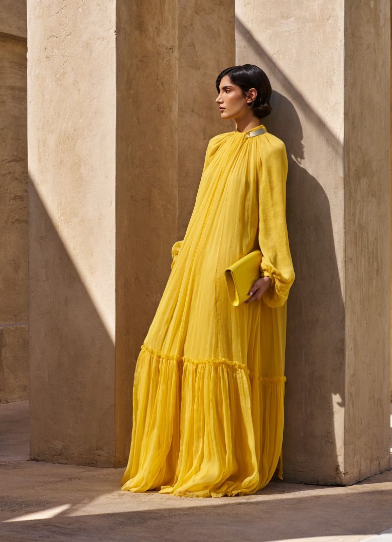 إليكِ العباية الشرقية الطابع المنفذة من التول الأصفر الحيوي والمبطنة بقماش نيود، وتتسم بأكمام طويلة وقصة مزمومة نحو الأسفل، وتمت زخرفة العنق بطوق من الجلد الذهبي. وتُعتبر هذه الإطلالة مثالية للأمهات اللواتي يرغبن في لفت الأنظار، فهذا الزيّ لا يمكنه أن يمر مرور الكرام.
