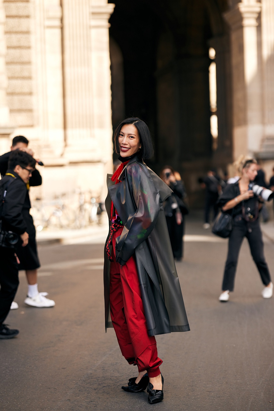 يُعَد المعطف البلاستيكي من أكثر الصيحات لفتاً للأنظار؛ خاصة مع ظهوره القوي ضمن أزياء الشارع خلال أسبوع الموضة في باريس. يتميز هذا التصميم بخامته الشفافة وقَصّته الواسعة التي تمنح الإطلالة طابعاً عصرياً غير تقليدي. وقد تم تنسيقه بأسلوب جريء مع توب وبنطلون باللون الأحمر؛ إضافة إلى كعب عالٍ أسود؛ مما خلق توازناً بين الجرأة والأناقة. كما نسقت دار سان لوران االمعطف النايلون على شكل فساتين تلبس لوحدها ونفذتها بألوان نيون حيوية لربيع وصيف 2026.
