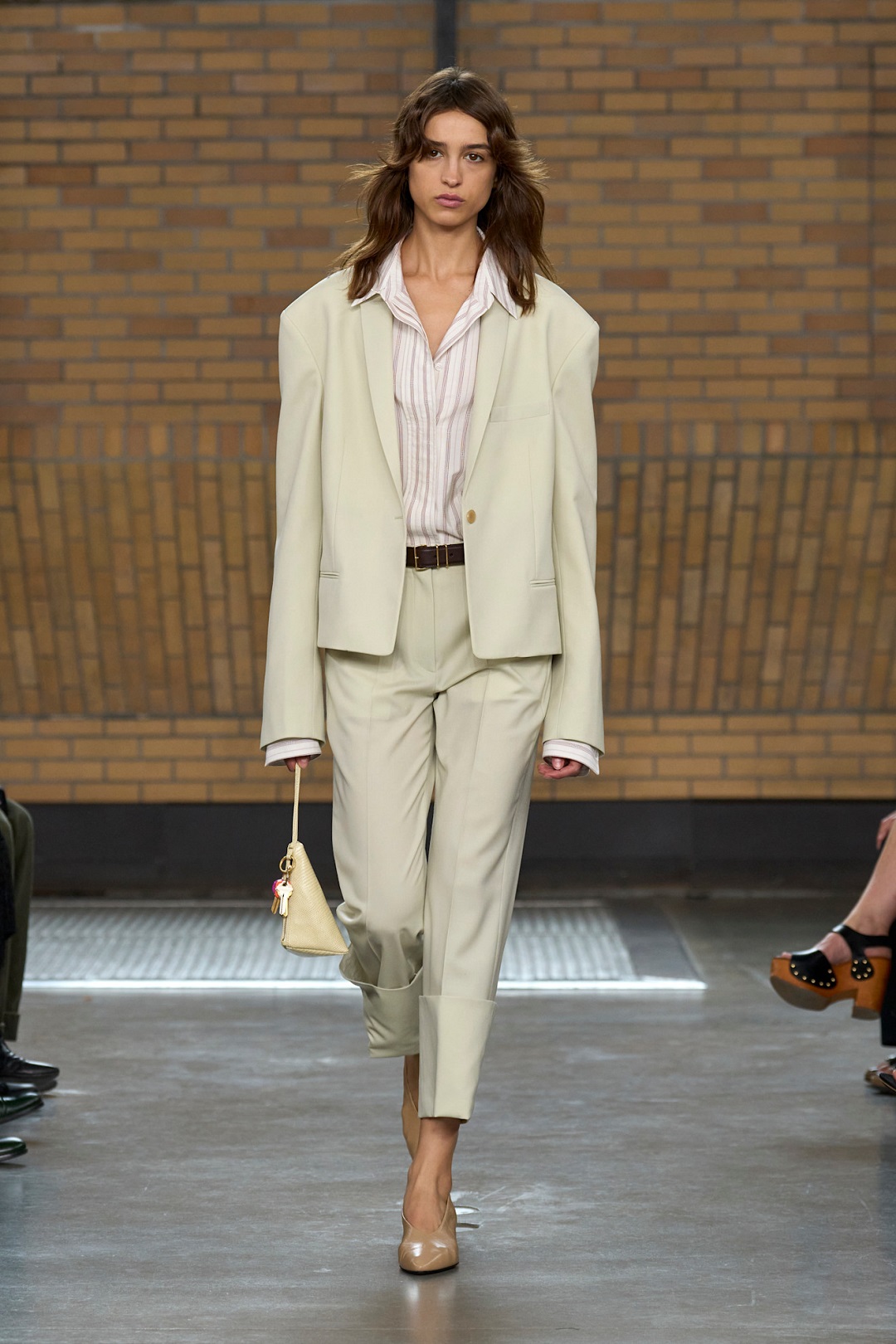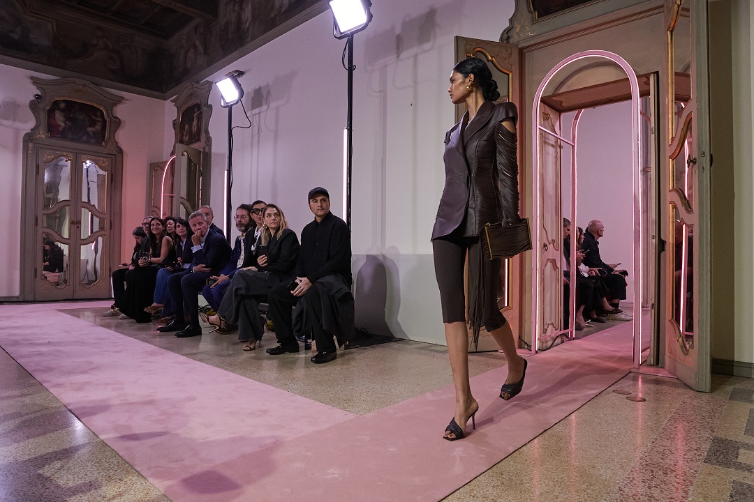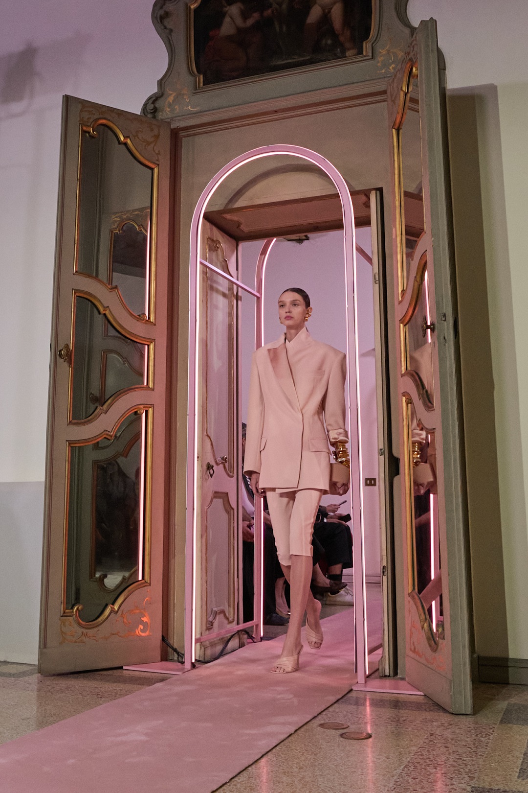 كذلك قدّمت إليزابيتا فرانكي Elisabetta Franchi أيضاً تنسيقاً أنيقاً يعتمد على الجاكيت الواسع، حيث جاء التصميم باللون الزهري النيود مع ياقة ساتان عريضة، وتم تنسيقه مع بيرمودا بنفس اللون لبدلة متكاملة تجمع بين النعومة والفخامة.