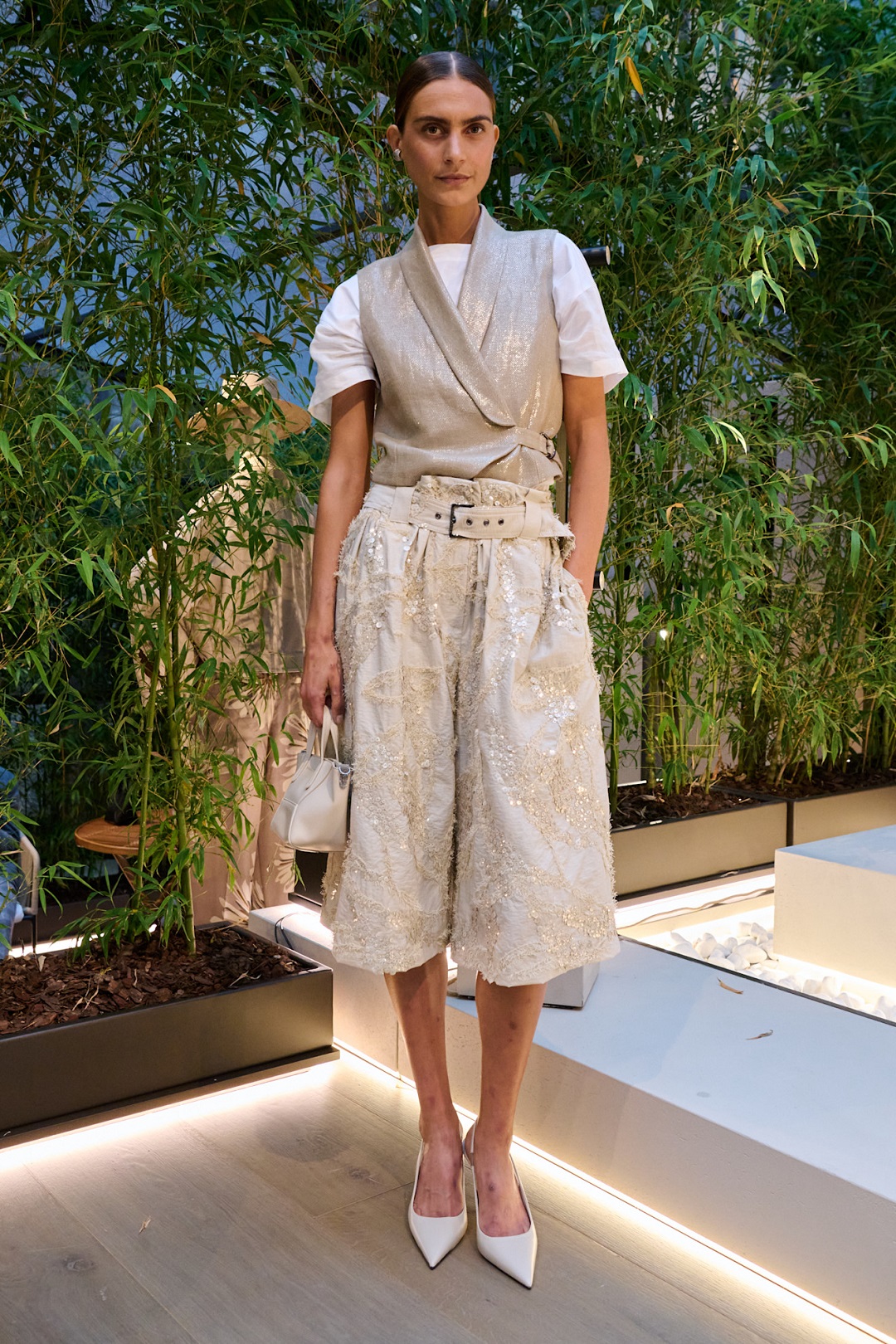 وفي تنسيق آخر من نفس العلامة، ظهرت البيرمودا بأسلوب مختلف مع جاكيت مصنوع من قماش الأوغانزا اللامع بقصّة قصيرة، وتم تنسيقها مع تيشرت أبيض لإطلالة تجمع بين الكاجوال والفخامة، إضافة إلى بيرمودا مطرزة وحقيبة صغيرة وحذاء مدبب أكمل اللوك بأسلوب أنثوي راقٍ.
