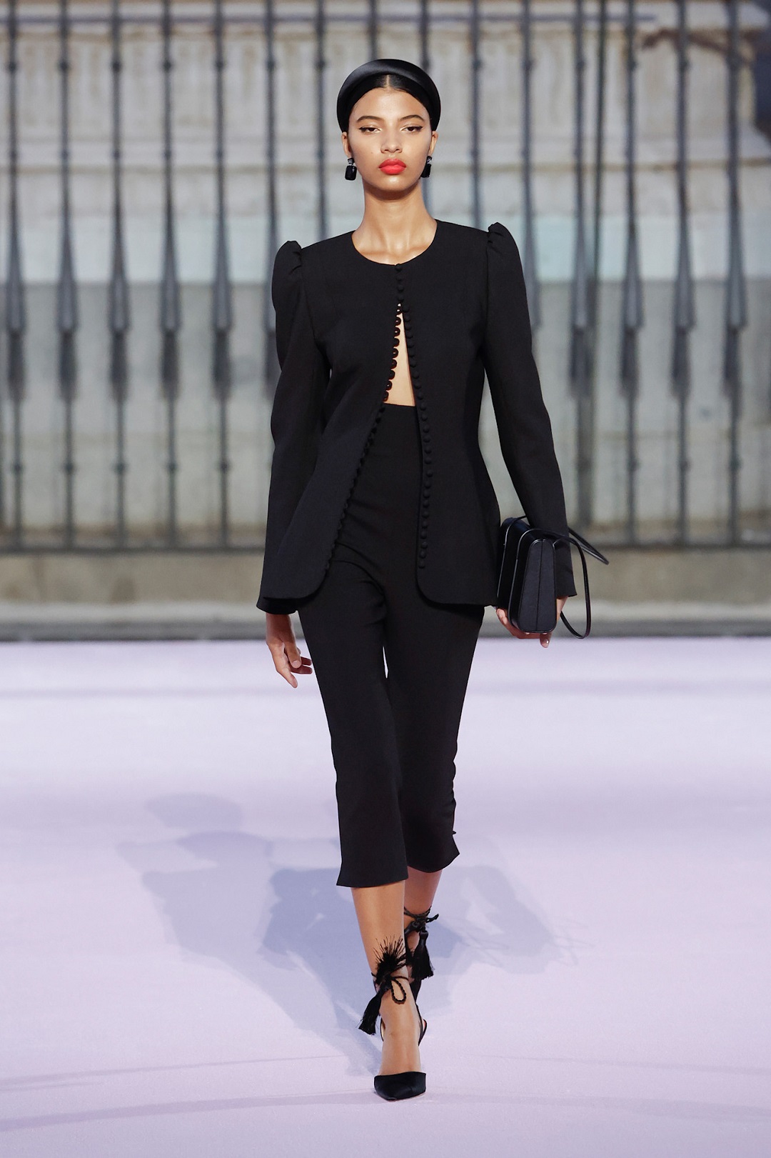 وفي تنسيق آخر من كارولينا هيريرا Carolina Herrera، ظهر البيرمودا بأسلوب كلاسيكي أنيق مع جاكيت بأكتاف مرفوعة وأزرار مفتوحة، تم تنسيقه مع بيرمودا سوداء عالية الخصر.