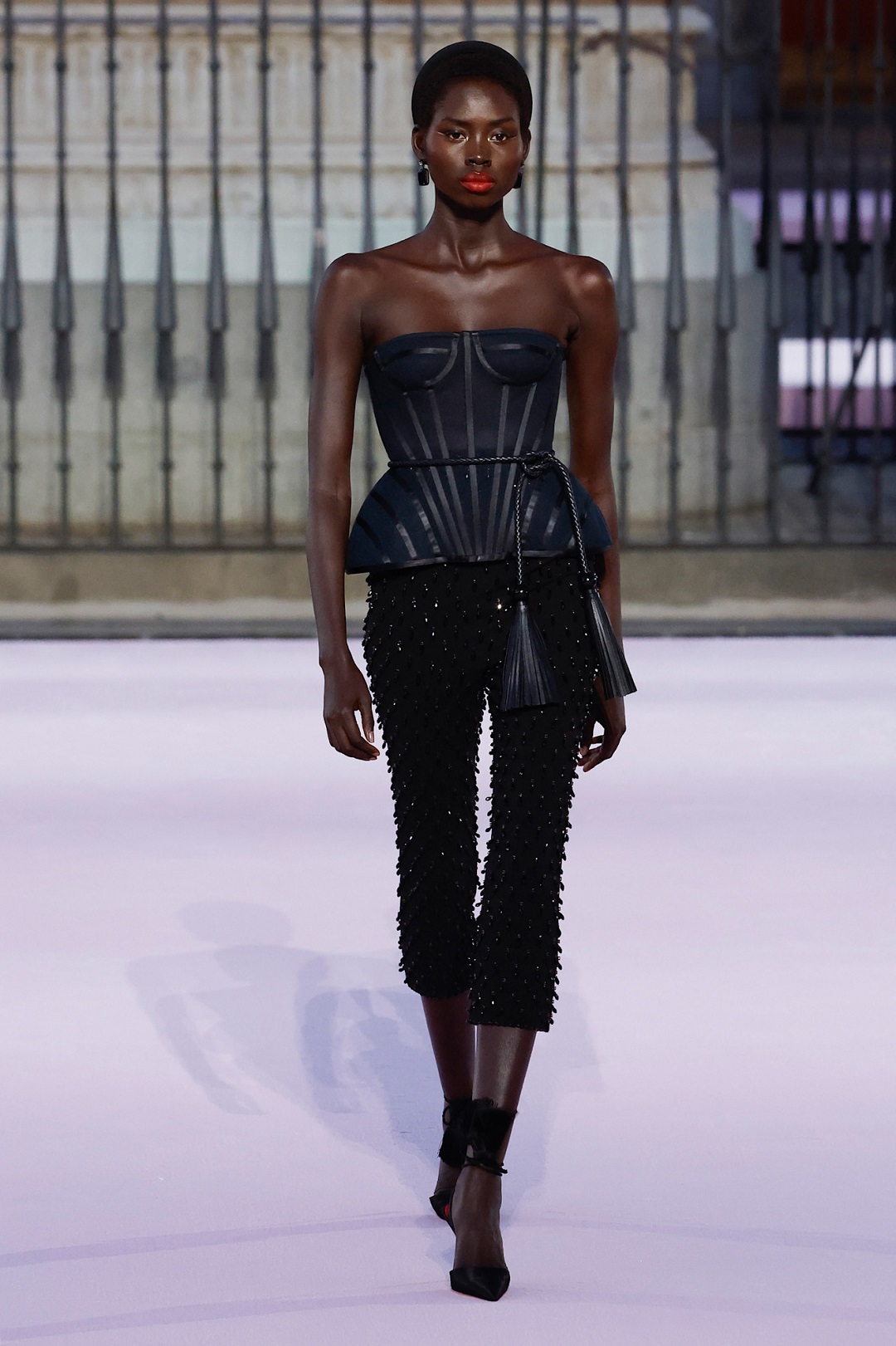 تم تنسيقه مع كورسيه باللون الكحلي، ورباط خصر من الجلد، إلى جانب حذاء برباط الكاحل، ما منح الإطلالة طابعاً أنثوياً جريئاً ومترفاً في الوقت نفسه.