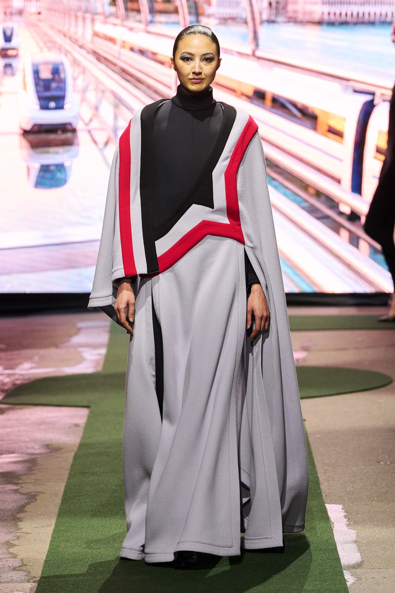 كما صممت دار بيار كاردان Pierre Cardin العباية بتوجه مستقبلي، فاستعانت بقماش من ألياف الكربون، وصممت بدلة جمبسوت مع عباية بيضاء طويلة ومقفولة، وتزدان بقطع من الجلد منفذ على شكل مثلثات بلون برغندي.