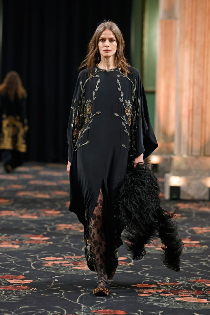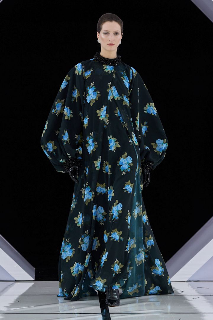 يُستخدم الشيفون غالباً في التصاميم متعددة الطبقات أو الأكمام المزخرفة، مما يُضفي مظهراً أنيقاً وانسيابياً. وقد صممت دار جوانا أورتيز Johanna Ortiz هذه العباية المصنوعة من الشيفون والمطرز بأحجار وكريستالات لامعة ملونة، ونسقتها مع مشلح من الفرو الأسود مع جوارب سوداء من الدانتيل الأسود.