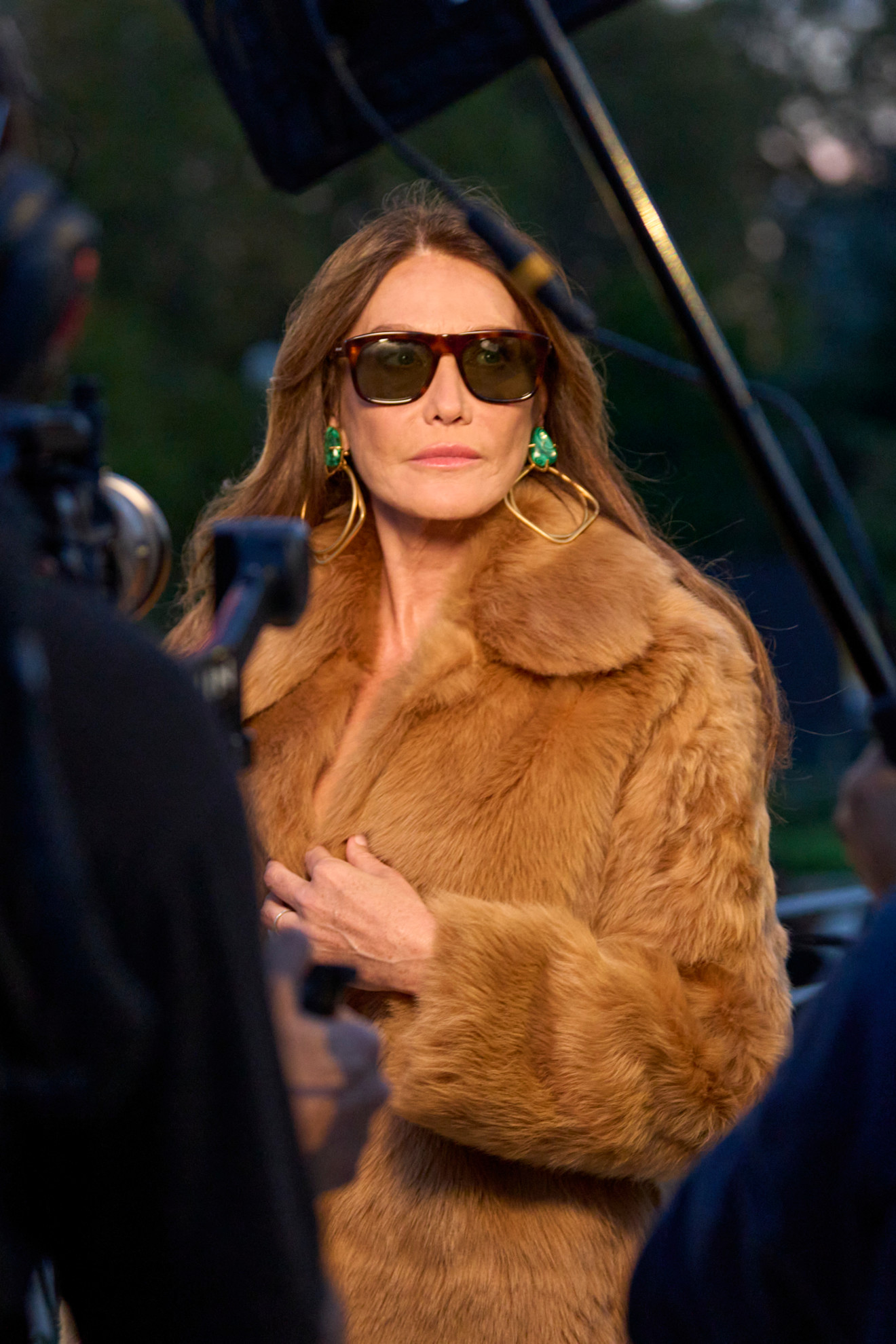 حضرت كارلا بروني Carla Bruni عرض سان لوران Saint Laurent بإطلالة كلاسيكية فاخرة تجسد الرقي الخالد؛ حيث تألقت بمعطف فرو ضخم باللون الجملي، مما أضاف لمسة من الدفء والفخامة لإطلالتها، وأكملت بروني اللوك بنظارات شمسية عريضة بإطار بلون البني وأقراط دائرية ضخمة مرصعة بقطع خضراء بارزة، ما أضفى على الإطلالة لوناً حيوياً ملفتاً.