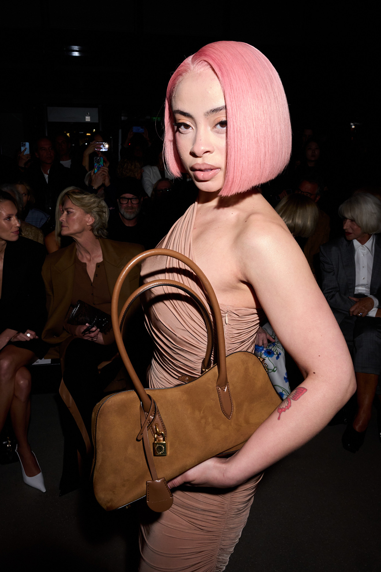 اعتمدت مغنية الراب آيس سبايس Ice Spice إطلالة لافتة ومختلفة في عرض ستيلا مكارتني Stella McCartney؛ حيث ارتدت فستاناً قصيراً مكشكشاً وضيقاً بكتف واحد باللون البيج أو النيود، وهو لون محايد أنيق، لكن اللمسة الأكثر جرأة كانت شعرها القصير والمستقيم باللون الوردي الفاتح، وقد حملت حقيبة يد من جلد الغزال باللون الجملي البني؛ لتجمع بين الأنوثة الجريئة والألوان الترابية الدافئة.