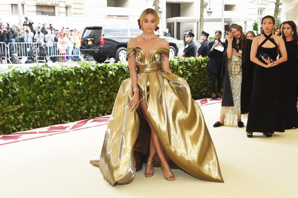 في العام 2018 تألقت النجمة جاسمين سوندرز Jasmine Saunders بفستان منفذ من القماش السائل المونوكرومي باللون الذهبي، واتسم بأكتاف منسدلة وقصة فكتورية منفوخة، تكشف عن فتحة أمامية جريئة، خلال حضورها حفل ميت غالا، والمفاجأة كانت اختيارها لعلامة إتش أند أم H &M التي نفذت لها فستانها. وفي العام 2023 فاجأتنا النجمة هيدي كلوم Heidi Klum باختيار فستان سائل باللون الفضي، ويتسم بقصة أكتاف منسدلة، ولكنه بقصة مستقيمة وطويلة، ونسقت معه حقيبة على شكل حوض سمك، خلال حضورها حفل Fashion Trust Awards.