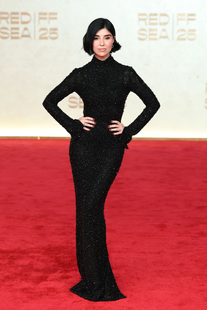 كما اختارت النجمة جيسيكا ألبا Jessica Alba أن تطل في مهرجان البحر الأحمر السينمائي 2025 بفستان بطراز إسباني وهو من التفتا الأسود ويتسم بقصة خالية من الأكمام مع فيونكة ويتميز بتنورة ضيقة تتسع تحت الركبتين مع ذيل قصير وقد توجته النجمة بتسريحة شينيون عالية مع غرة كثيفة على الجبين ومكياج ترابي.