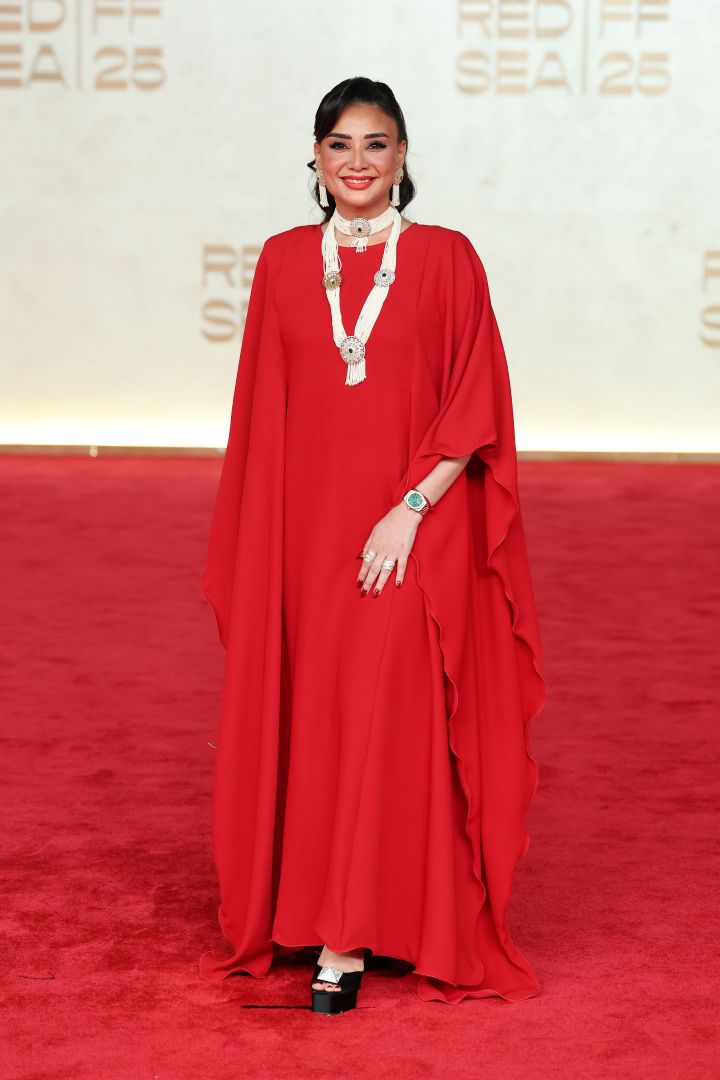 اعتمدت النجمة رؤى المدني الطابع الشرقي المحتشم فاختارت القفطان الحريري الأحمر الذي يتسم بقصة واسعة وطابع مونوكروم وانتعلت الصندل الأسود المزخرف بمشبك ذهبي، وتميزت بمجوهرات رائعة كالعقد الطويل المطعم باللؤلؤ والأحجار الكريمة ولفتتنا الساعة المزدانة بمينا أخضر على قاعدة من الذهب الأصفر.
