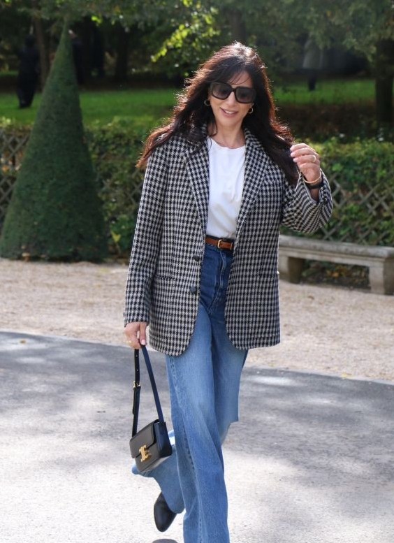 تفضل النجمة نادين لبكي اللون الأسود حتى في إطلالاتها النهارية العملية فحتى ولو لم يكن الزي باللون الأسود بالكامل ولكن لمسة منه تكفي، فلقد اختارت النجمة مؤخراً وهي تجوب شوارع باريس السروال الجينز الواسع مع تي شيرت قطنية بيضاء ونسقت البليزر الواسعة المربعة التقطيع باللونين الأسود والأبيض من سيلين Celine. وأضافت الأكسسوارات السوداء التي تمثلت بحقيبة جلدية وحذاء بكعب عالٍ. كما عقدت حزاماً جلدياً بنياً رفيعاً ووضعت نظارات كبيرة سوداء.