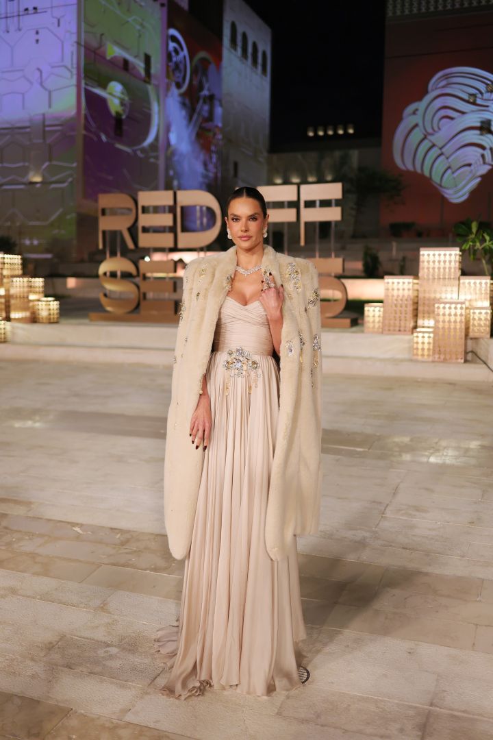 تألقت عارضة الأزياء العالمية أليساندرا أمبروسيو Alessandra Ambrosio في حفل ليلة الختام بإطلالة كلاسيكية ساحرة باللون العاجي الفاتح، جاء الفستان بقصة مفتوحة بياقة القلب وضيقة من الأعلى، مزيناً بتطريزات ناعمة حول الخصر، أكملت الإطلالة بسترة الكاب الطويل الذي يتدلى بأناقة من كتفيها؛ ما أضفى عليها لمسة من الفخامة الملكية.