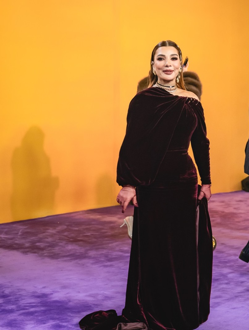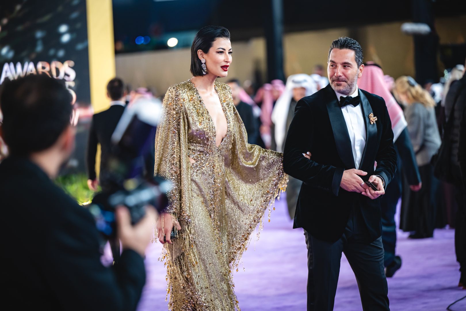 تميّزت إطلالة العارضة ريم السعيدي بفستان ذهبي يزدان بشراريب ذهبية، ويتسم بأكمام طويلة وياقة منخفضة، وهو من تصميم المبدع زهير مراد. وتزيّنت بمجوهرات من شوبارد Chopard، ولفتتنا الأقراط المتناغمة مع انعكاس ألوان الفستان تحت الإضاءة.