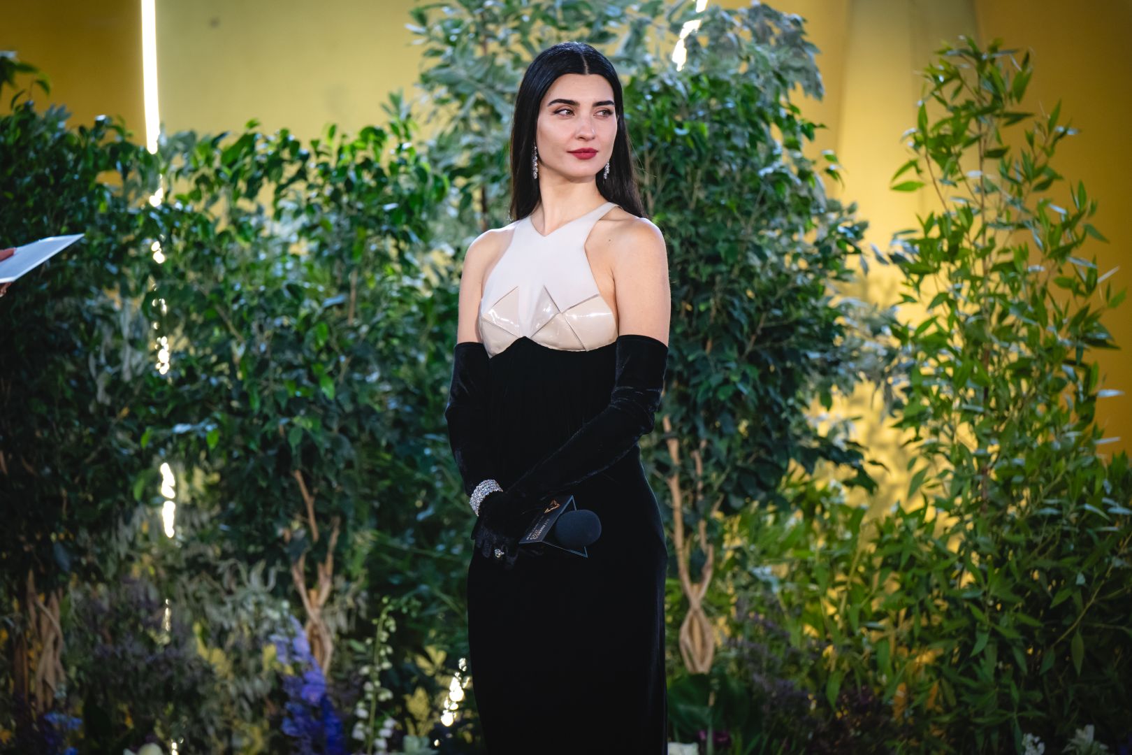 أعادتنا النجمة رزان جمال على طريقة نجمات الأربعينيات إلى الزمن الجميل بفستان مخملي، يتميّز بياقة مربعة أنثوية وتنورة منفوخة، ويتسم بطابع مونوكروم، وتوّجت إطلالتها بتسريحة شينيون مشدودة إلى الوراء. كما تزيّنت بعِقد ساحر من الألماس على قاعدة من الذهب الأبيض. الفستان من توقيع ديور Dior، والمجوهرات من دار كارتييه Cartier.