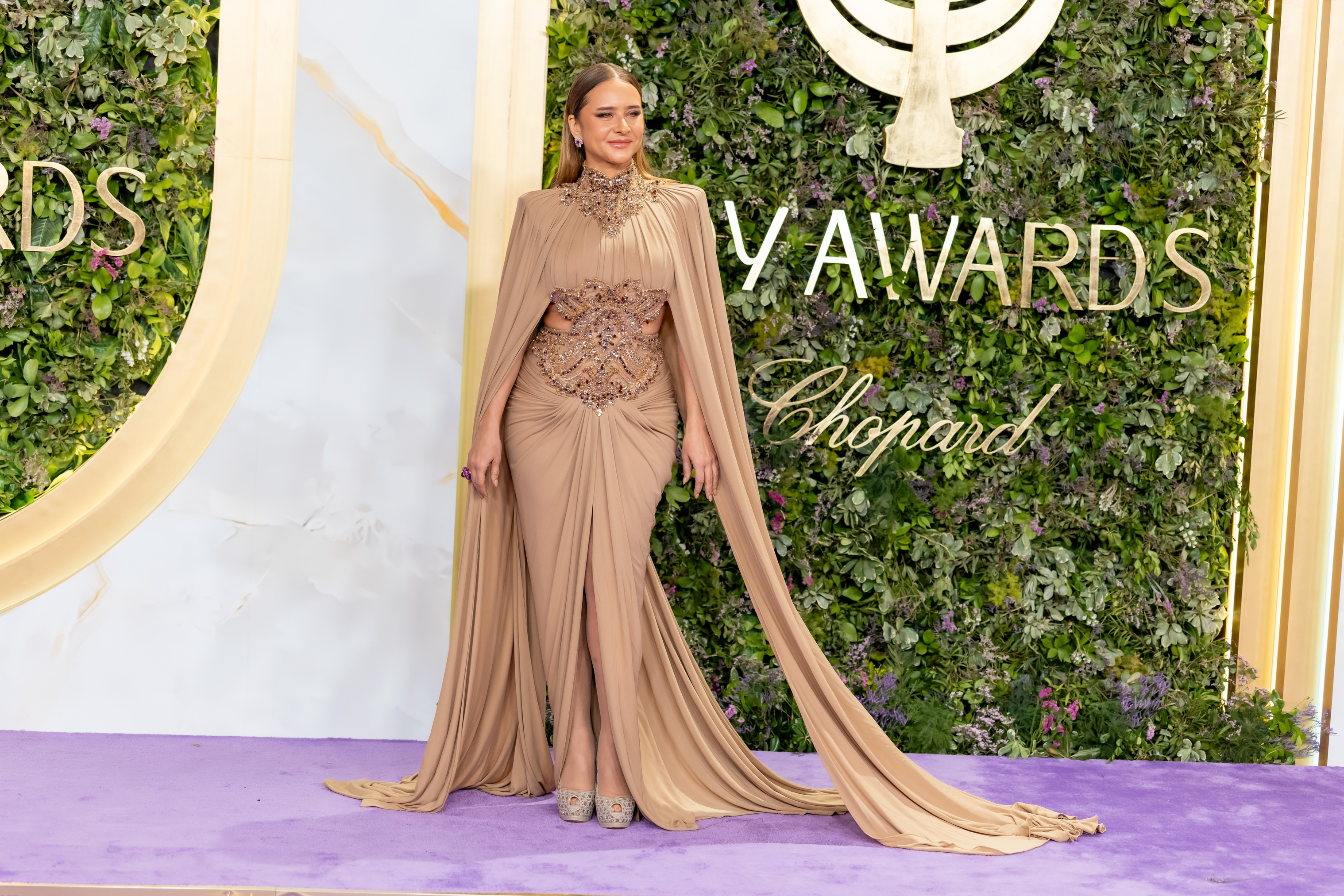 اختارت مايا دياب إطلالة درامية فخمة حيث تألقت بفستان أسود وفضي مرصع بتطريزات فضية كثيفة تغطيه بالكامل، مع قصة ضيقة تحدد الجسم بحمالات منسدلة، وأكملت اللوك برداء واسع الأكمام وبتصميم ضخم ولافت للأنظار ينسدل إلى الأرض؛ ما منحها لمسة راقية وساحرة على السجادة الخزامية، ونسَّقت معه مجوهرات فاخرة ومرصعة بالألماس.