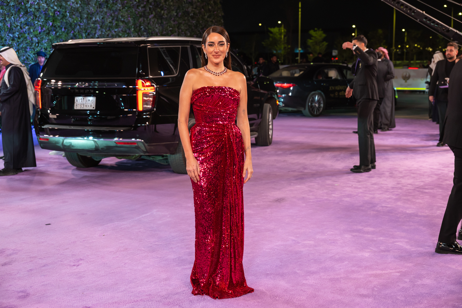 خطفت أسيل عمران الأنظار بإطلالة جمعت بين الرقي الكلاسيكي والأنوثة، حيث اختارت فستاناً من تصميم زهير مراد تميز بمزج عبقري بين الخامات والألوان، الجزء العلوي بقماش المخمل الأسود الفاخر بحمالة واحدة، بينما انسدلت التنورة بأسلوب الدرابيه الانسيابي من قماش الساتان باللون الوردي العتيق Dusty Rose مع ذيل طويل يمنح لمسة ملكية على السجادة الخزامية. ولإضفاء طابع درامي متكامل؛ أكملت أسيل إطلالتها بقفازات طويلة من المخمل الأسود وحقيبة يد كروية بطابع رخامي.