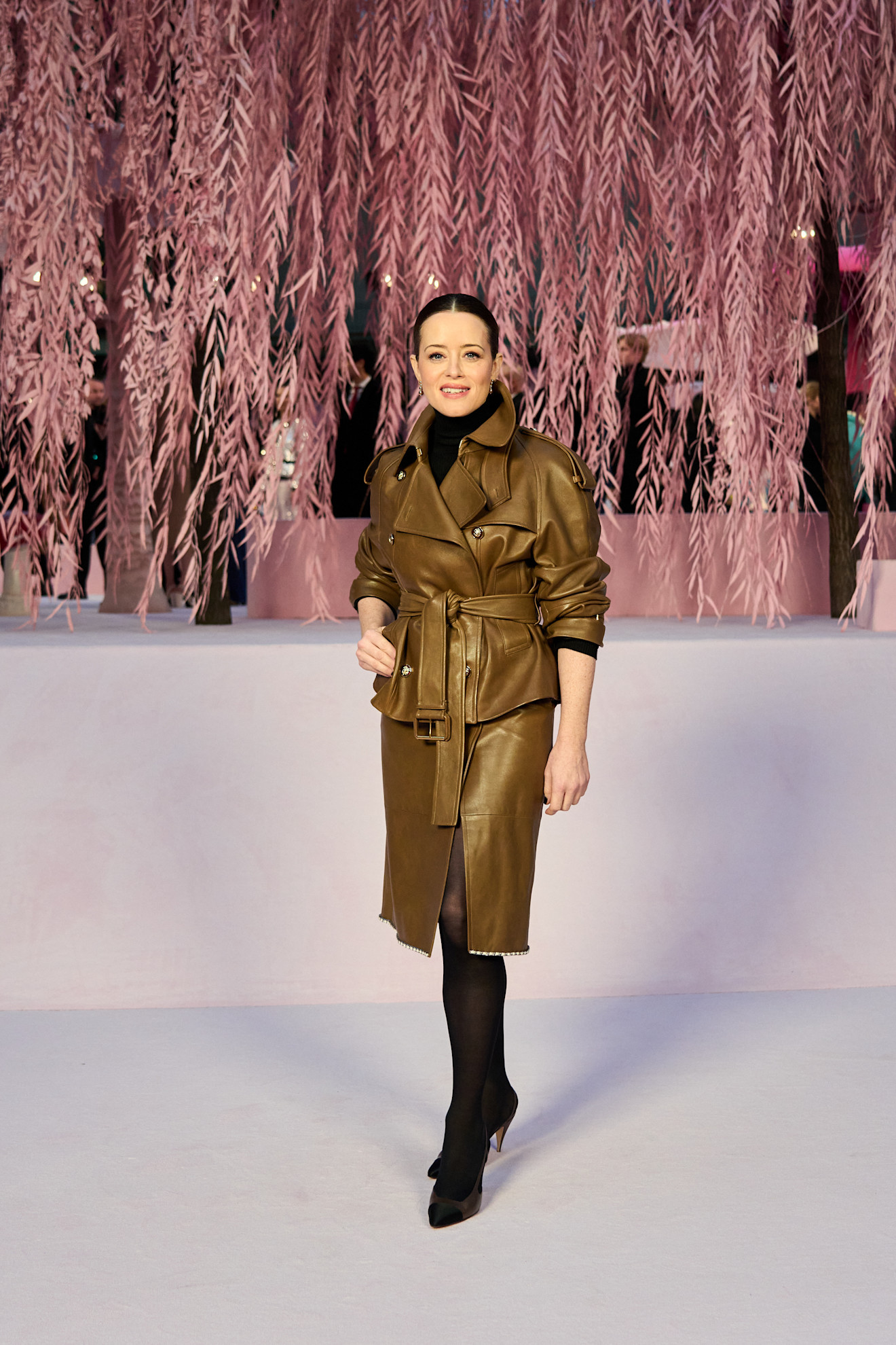 اعتمدت كلير فوي Claire Foy إطلالة جذابة وراقية من الجلد باللون البني المائل للأخضر الزيتوني، تكون من جاكيت ترنش قصير بخصر محدد وحزام ومزينة بأزرار معدنية، مع تنورة ميدي متطابقة بشق أمامي، مع جوارب سوداء داكنة، وحذاء بكعب عالٍ.