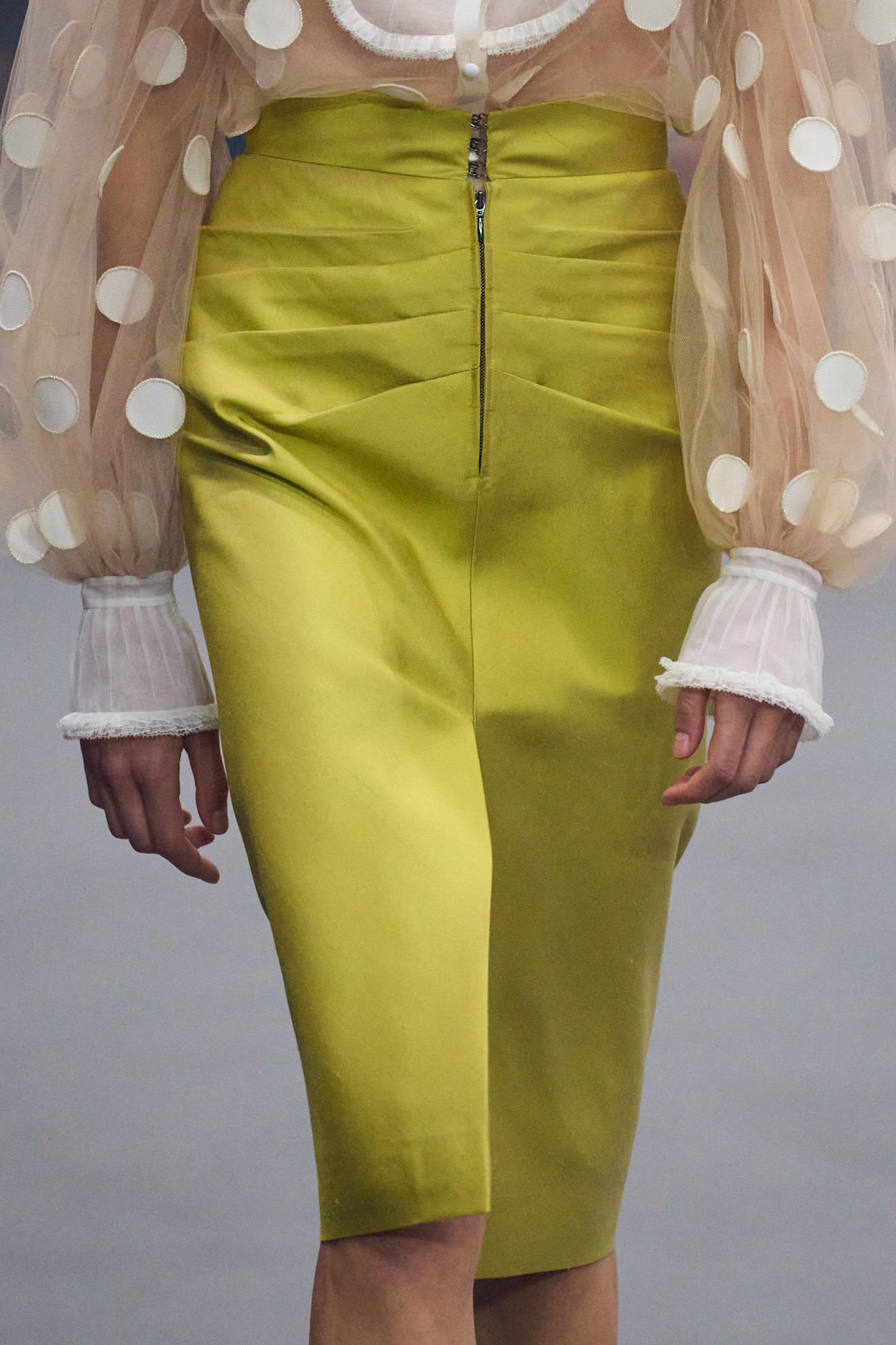 وأعجبتنا هذه التنورة الميدي العمودية أيضاً من فالنتينو بشق أمامي وكشاكش تزين الخصر مع سحابة تتوسطها، تم تنسيقها مع قميص شفاف مزين بالبولكا دوتس البيضاء.