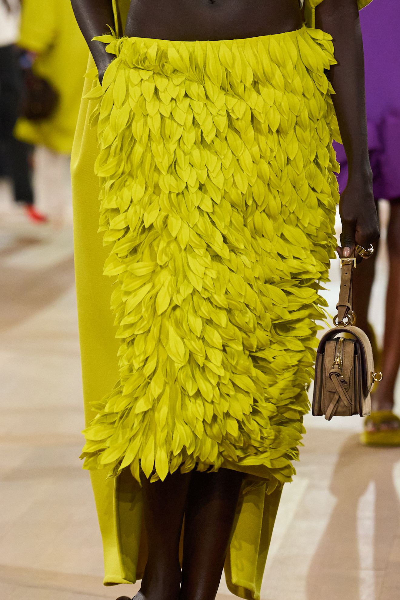 ولفتتنا هذه التنورة من بالنسياغا بهذا اللون النابض بالحياة، تميزت بقصة مستقيمة قصيرة من الأمام وطويلة من الخلف، مغطاة بأوراق الشجر لتتناسب تماماً مع أجواء الربيع.