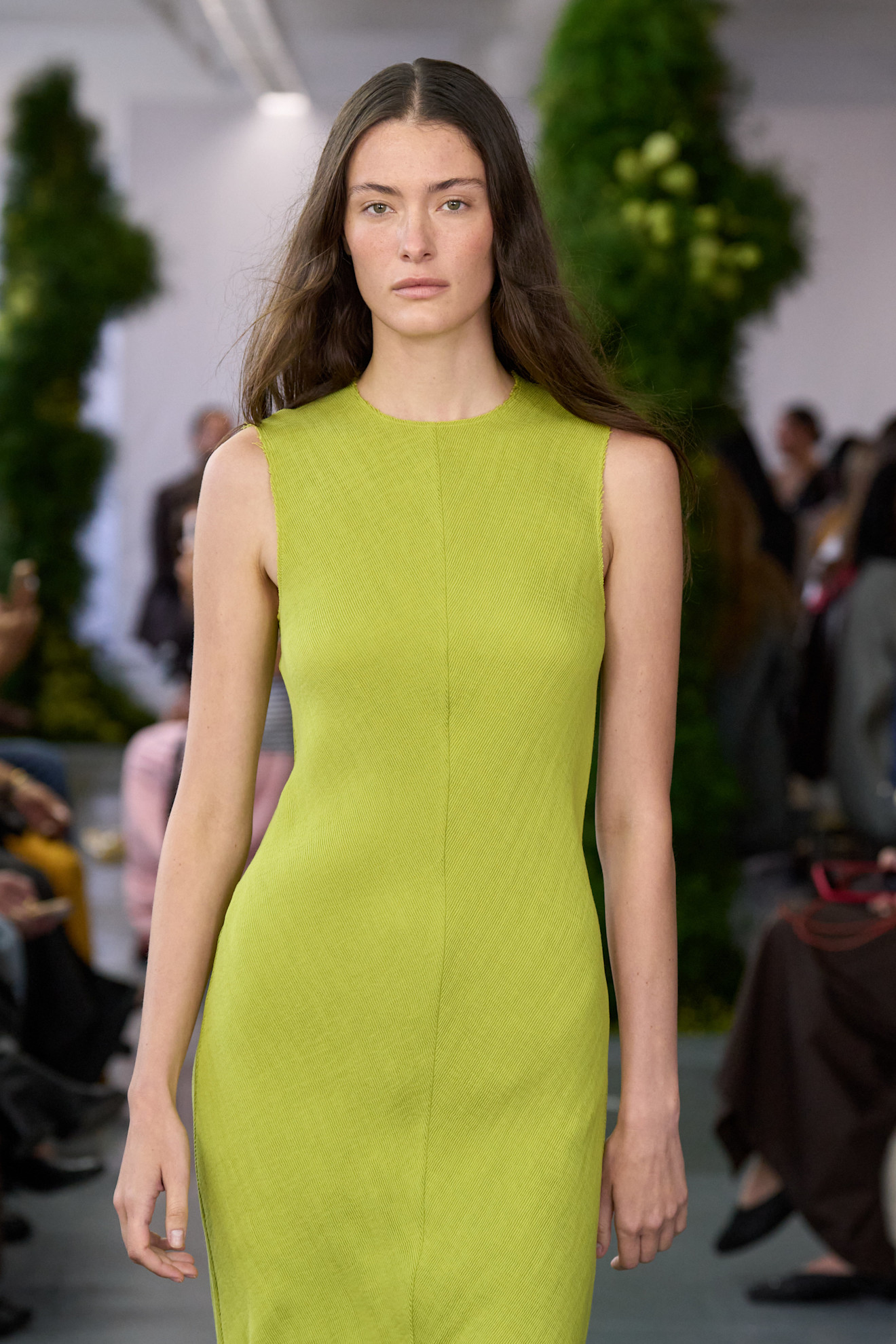 أيضاً ظهر لون الشارتروز في عرض أزياء تيبي Tibi بتصاميم ناعمة وعصرية، مثل هذا التصميم الربيعي الهادئ من دون أكمام وبقصة عمودية بسيطة.