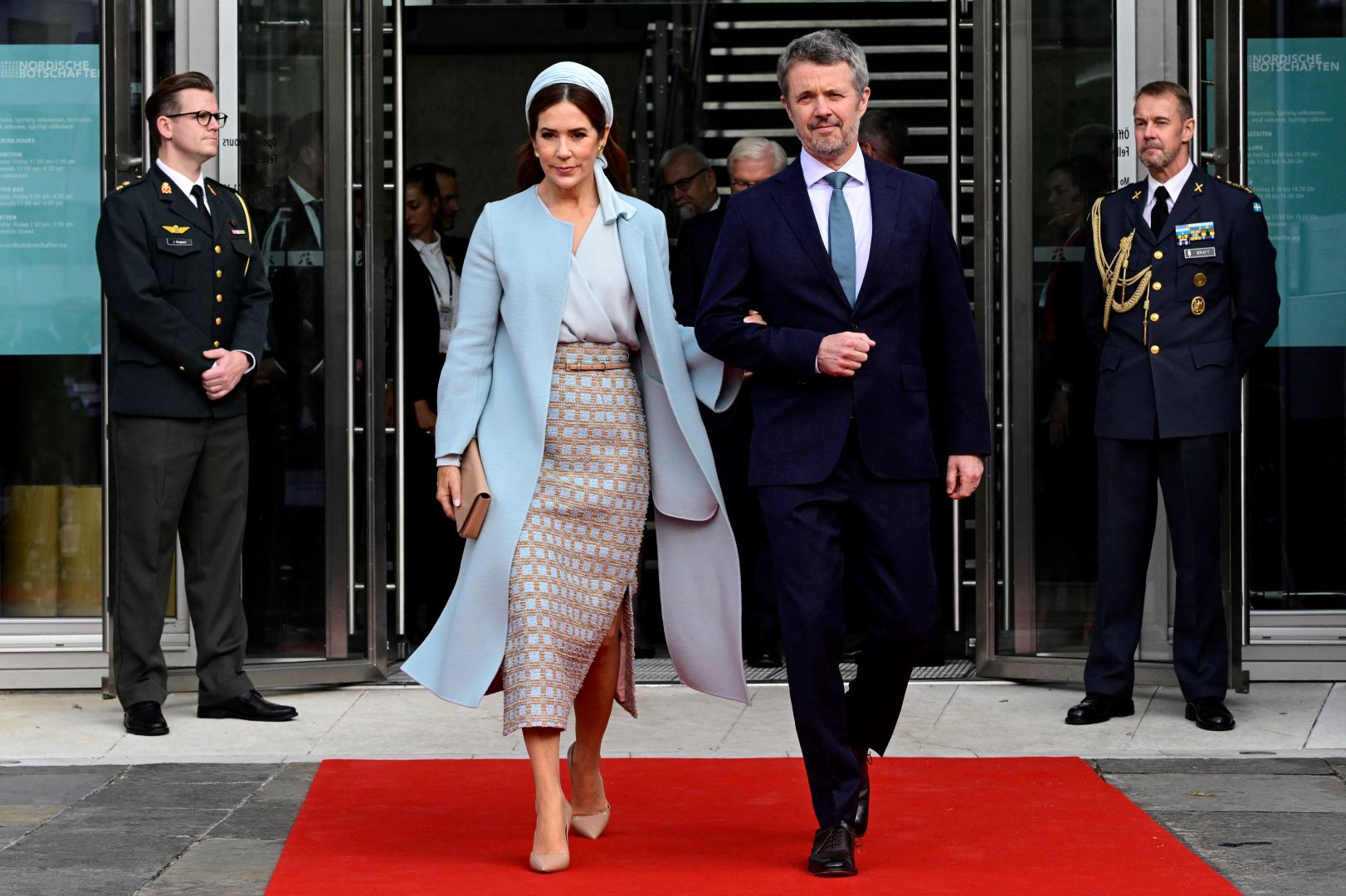 عندما رافقت الملكة ماري الملك فريدريك العاشر خلال زيارة رسمية استمرت يومين إلى ألمانيا، ارتدت ملكة الدنمارك مجموعة من الإطلالات الأنيقة، أبرزها إطلالة شديدة الأناقة قوامها معطف باللون الأزرق المبودر.