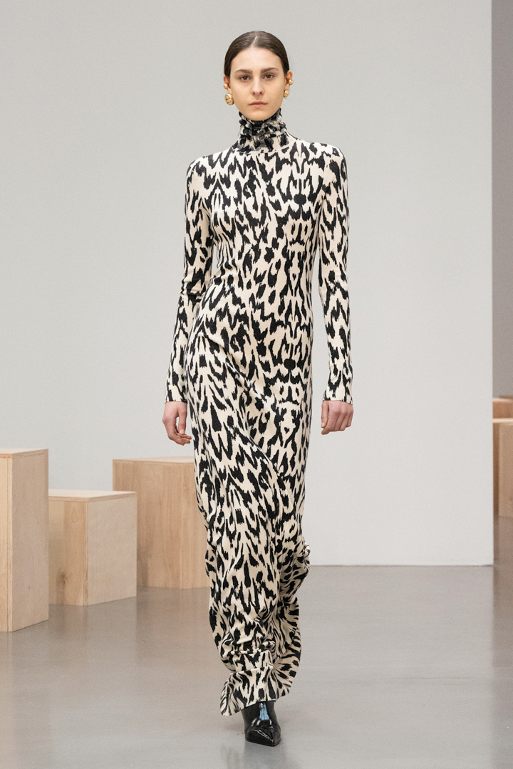 بعيداً عن الألوان الدافئة والرصينة التي تسيطر عادة على فساتين الخريف، اتجهت الكثير من الماركات إلى الفساتين المطبعة، فأضفت بعض الحركة على قطع نراها الأنسب لسهرة رأس السنة، في حال كنتِ تفتشين عن ستايل غير نمطي، ولتقريب الصورة أكثر ندعوك إلى مشاهدة الفستان الأبيض المزخرف بالأسود والمميز بقصته المستقيمة غير الملاصقة للجسم وياقته العالية من تشكيلة براندون ماكسويل Brandon Maxwell، وننصحك بتنسيقه مع بوت أسود، وحقيبة كلاتش عريضة باللون الأحمر أو البرغندي، وغطي رأسك بطرحة سوداء سادة، وزيني أذنيك بأقراط متوسطة الحجم من الذهب الأصفر.