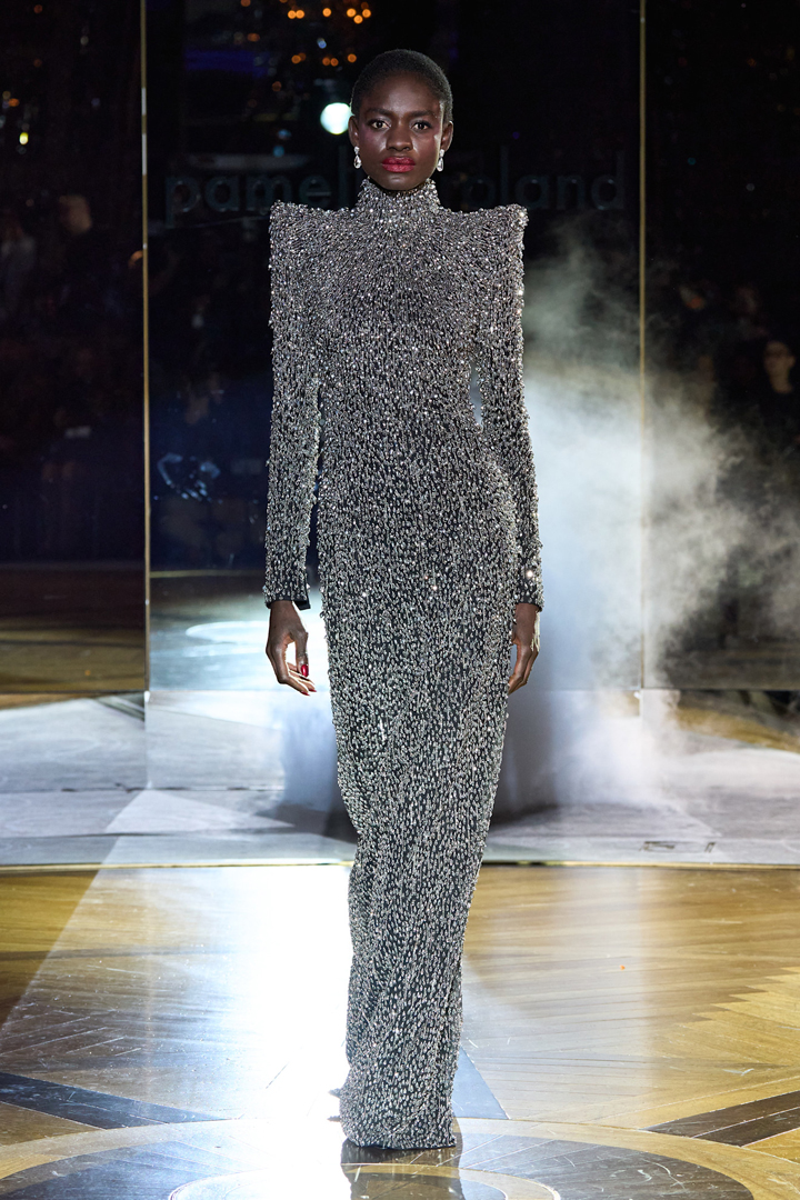 أحيت عروض خريف 2025 موضة الثمانينات، وكانت الأكتاف البارزة سيدة الموقف فزينت الجاكيتات والمعاطف وحتى فساتين السهرة، وأهدت باميلا رولان Pamella Roland المرأة المحجبة تصميماً شديد الفخامة جمع بين الاحتشام والفخامة، فقد ازدان بالكامل بالتطريز البراق وأتى بياقة عالية، ستمكنك من اعتمار التوربان، اكتفي بالتفاصيل الكثيرة في الفستان ولا ترتدي أكثر من أقراط صغيرة وخاتم ناعم؛ لتزيني هذه الطلة، أما الحذاء والحقيبة فيفضل أن يكونا باللون الأسود السادة.