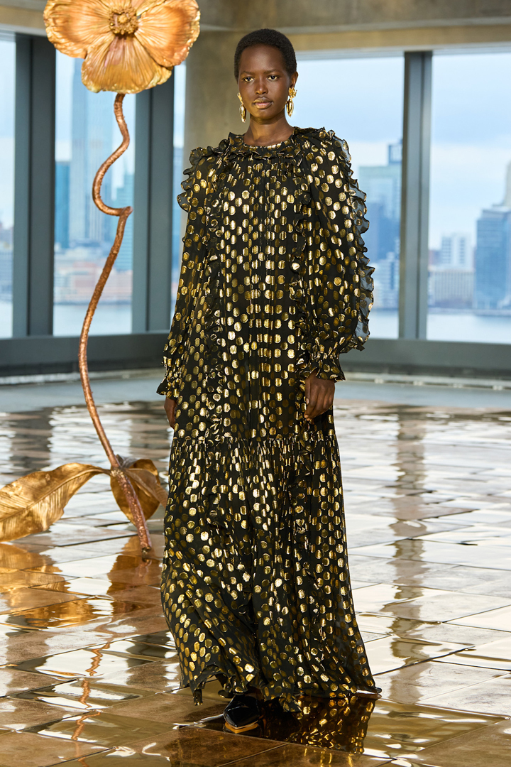 لم تغب فساتين السهرة المنقطة Polka Dots Dresses عن عروض الأزياء الجاهزة، وبخلاف ثنائية الأبيض والأسود الكلاسيكية المرتبطة في الأذهان بهذه النقشة الخالدة، فضلت ماركة أولا جونسون Ulla Johnson، أن تزين الفستان الشيفون الواسع المزدان على الأكمام بالكشاكش بنقاط ذهبية؛ ليتحول إلى قطعة مسائية فخمة ستحبها النساء المحجبات، ما رأيك في تنسيقه خلال احتفالية رأس السنة مع حذاء أسود سادة وحقيبة كلاتش ذهبية صغيرة؟ وغطي رأسك بتوربان أسود وزيني أذنيك بأقراط كبيرة من الذهب الأصفر.