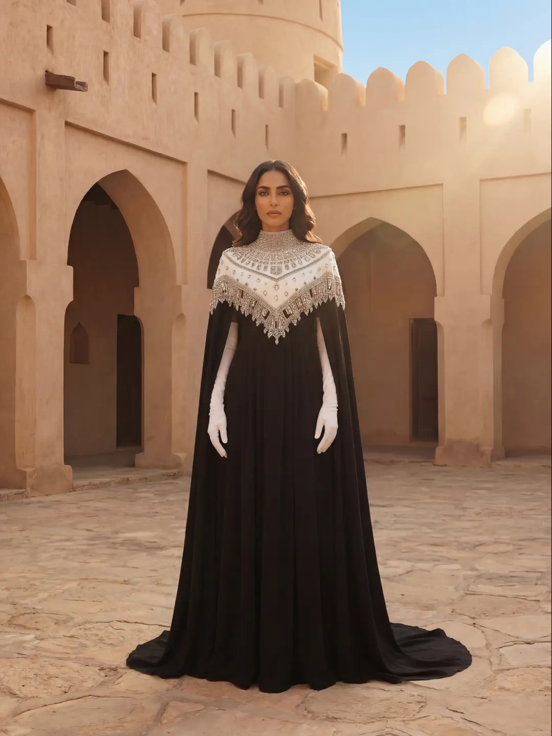 اخترنا لوحة ألوان مستوحاة من تدرجات الصحراء عند الغروب، البيج الدافئ، الذهبي الرملي، درجات العاجي، ولمسات من ألوان الليل العميقة. الخامات تعكس نقاء الطبيعة، أقمشة خفيفة، شفافة جزئياً، تتحرك مع الجسد. الرمزية في المجموعة ترتبط بفكرة الهدوء الداخلي والقوة الصامتة، سحر لا يفرض نفسه، بل يترك أثراً طويل الأمد.